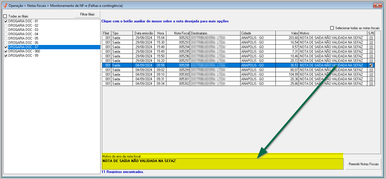 Ao clicar em uma nota, logo abaixo, na seção "Motivo do erro da nota fiscal", o sistema destacará o motivo da falha no envio da nota fiscal.