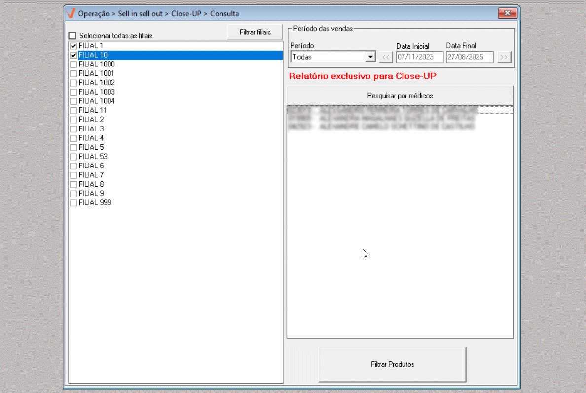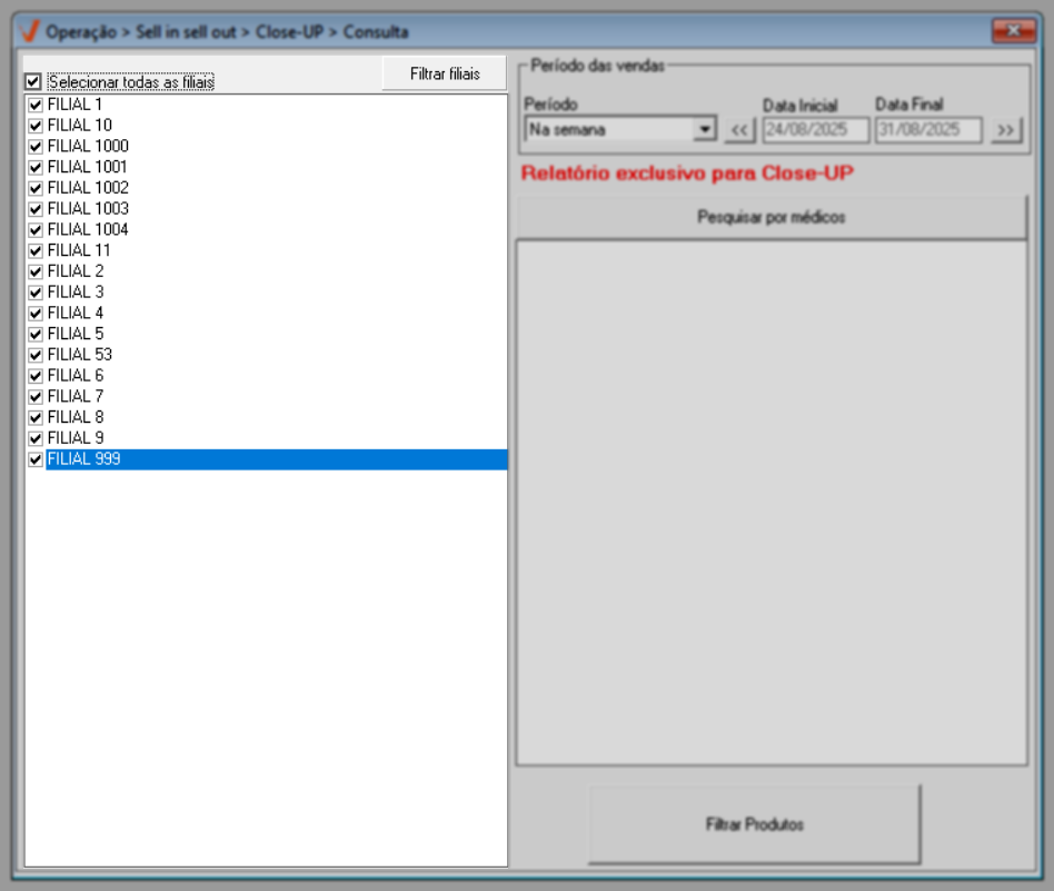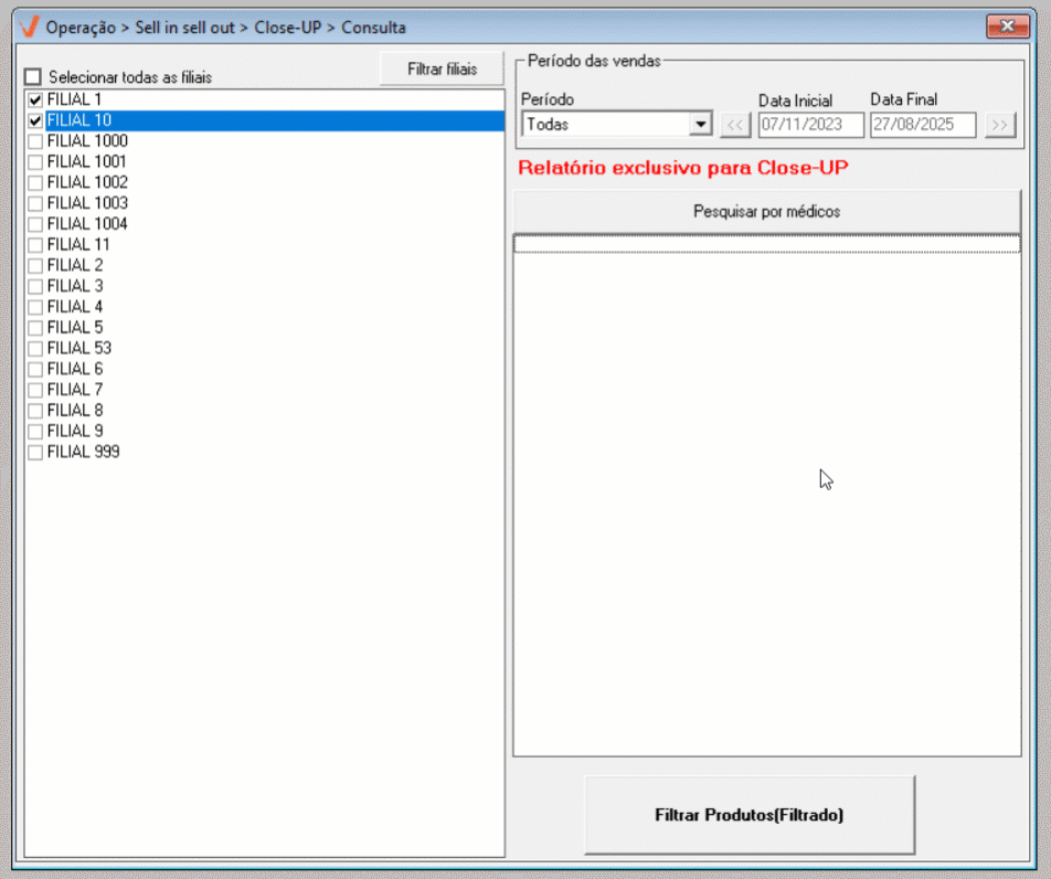 Esta tela permite ao usuário consultar de forma abrangente as informações de Sell-in e Sell-out, destinadas exclusivamente à empresa parceira Close-UP, por meio de um relatório dinâmico, através do qual o usuário tem a possibilidade de incluir os dados que deseja visualizar. Com este modelo de relatório, elimina-se a necessidade de gerar arquivos para exportação.