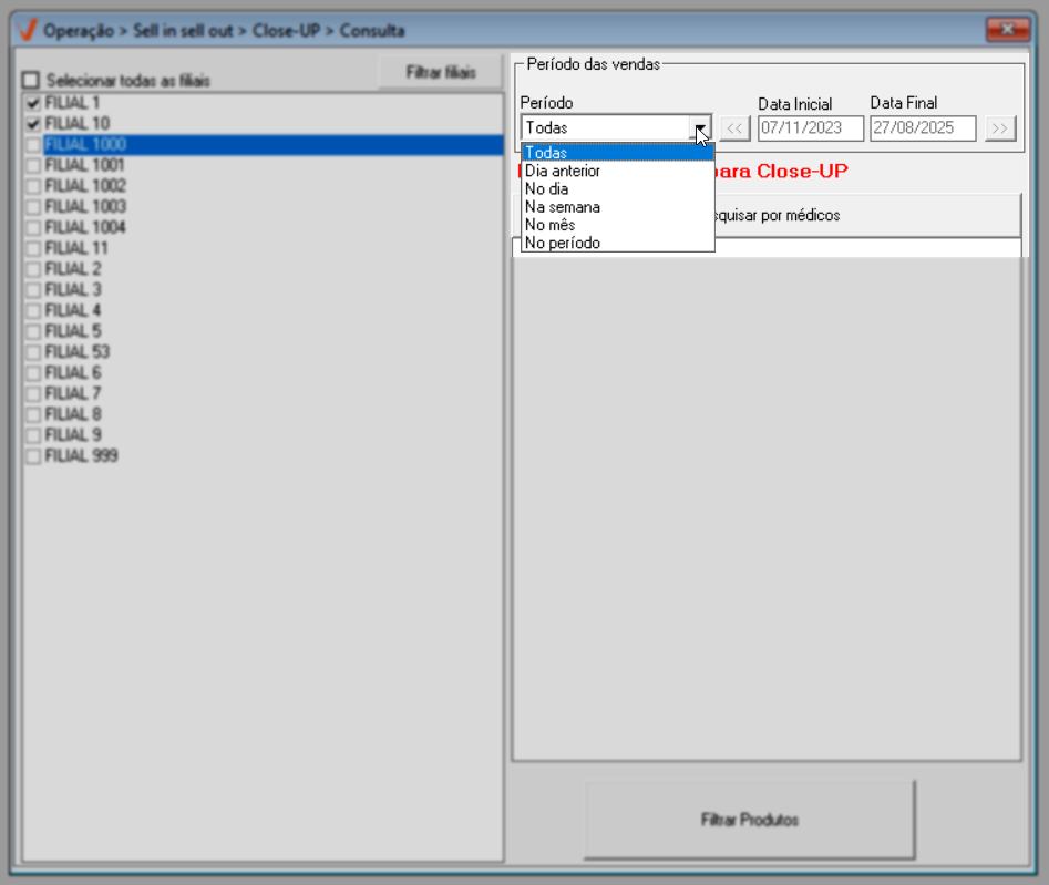- Acesse o menu: Operação >> Sell-in e Sell-out >> Close-up >> Consulta.