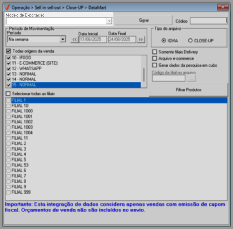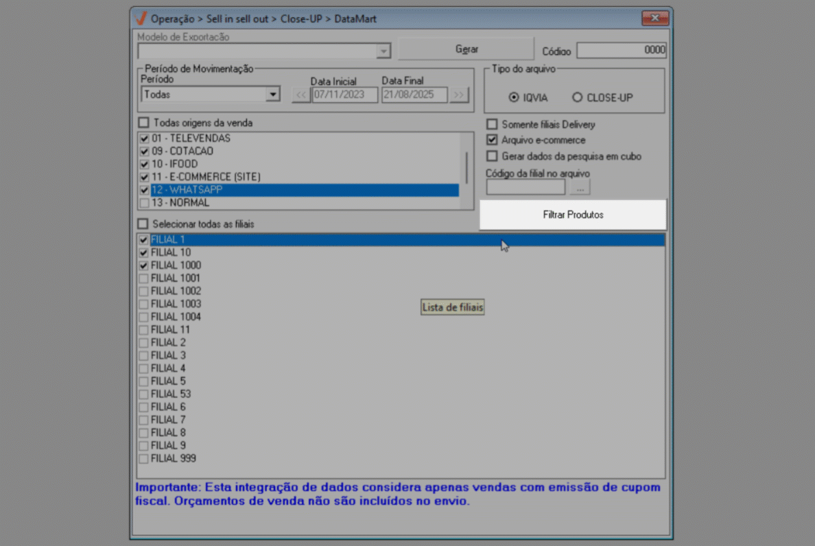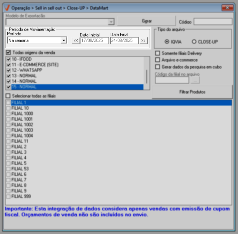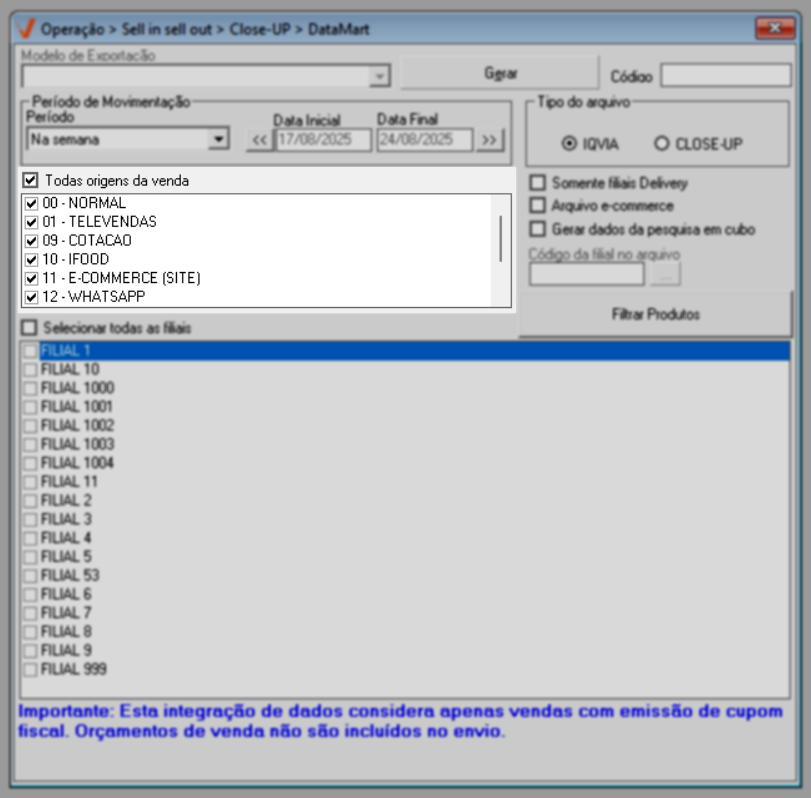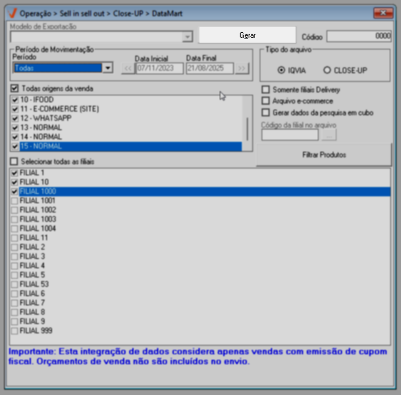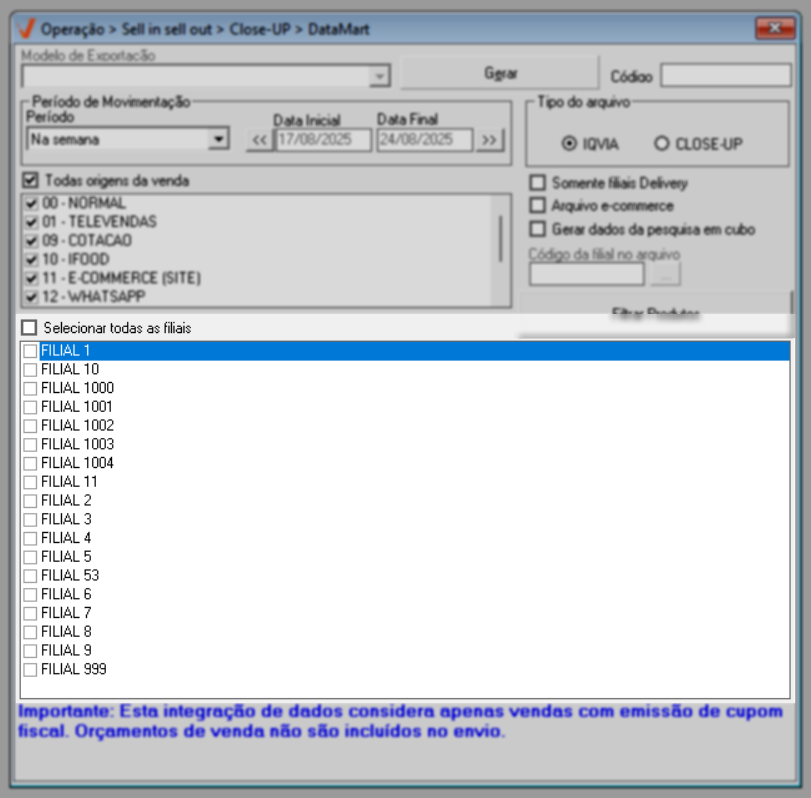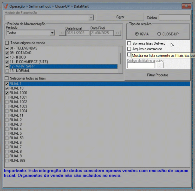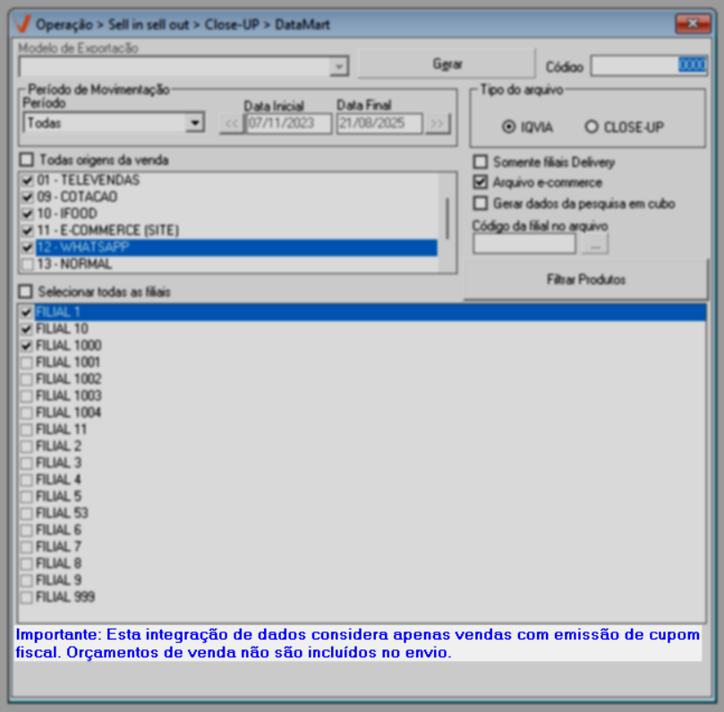 Para que a tela gere resultados confiáveis e válidos, é imprescindível que o parâmetro "Principal venda da filial é por delivery", localizado no cadastro da filial (Cadastro >> Pessoas/Filiais - Aba: Dados da Filial), esteja devidamente marcado. Essa configuração indica que a filial é do tipo delivery, o que, por sua vez, resultará na inclusão desse tipo de loja para geração do arquivo.