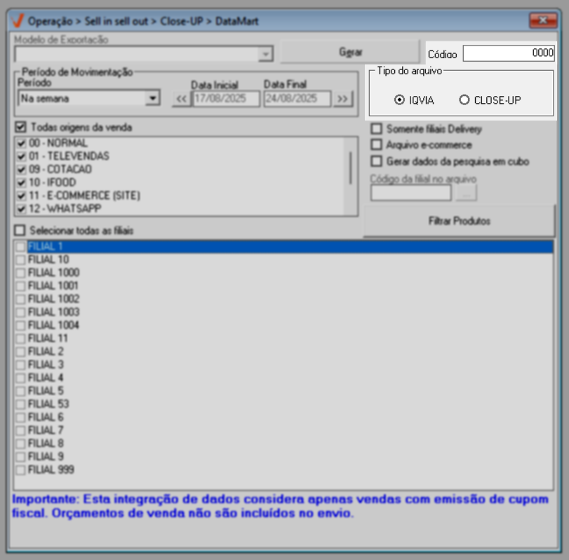 À direita, informe no campo "Código" a identificação da rede, em seguida em "Tipo de arquivo", escolhendo entre as opções "IQVIA" ou "CLOSE-UP". A opção "IQVIA" é destinada ao envio de dados conforme os padrões estabelecidos pela IQVIA, enquanto "CLOSE-UP" refere-se à exportação de dados no formato requerido pela plataforma Close-up. A escolha do tipo de arquivo deve ser feita com base no destino dos dados a serem gerados.