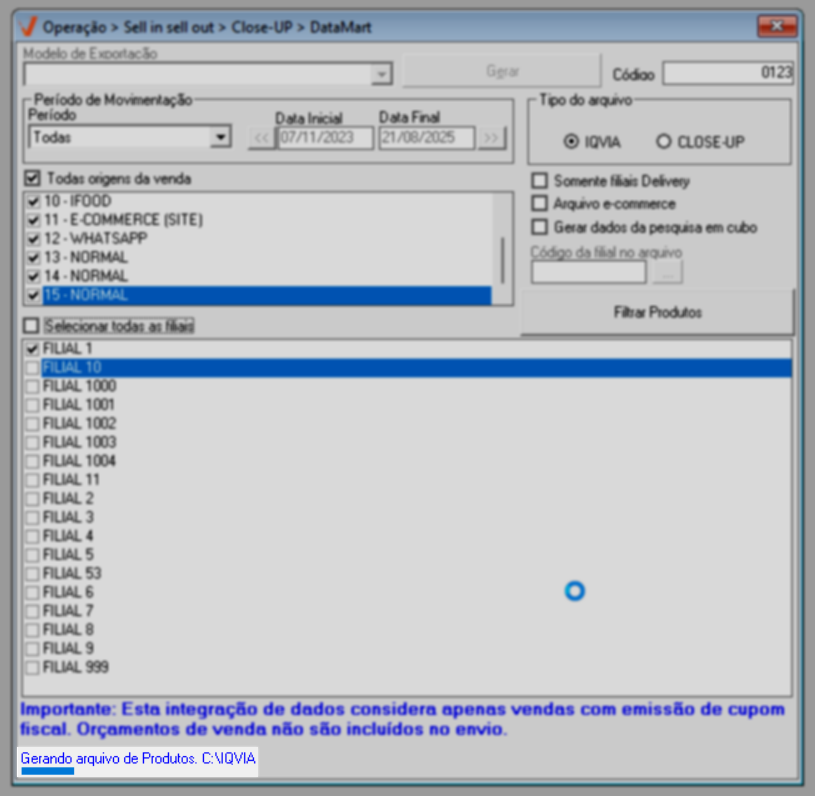 - Arquivo e-commerce: será gerado um arquivo e-commerce através do código da filial selecionada.