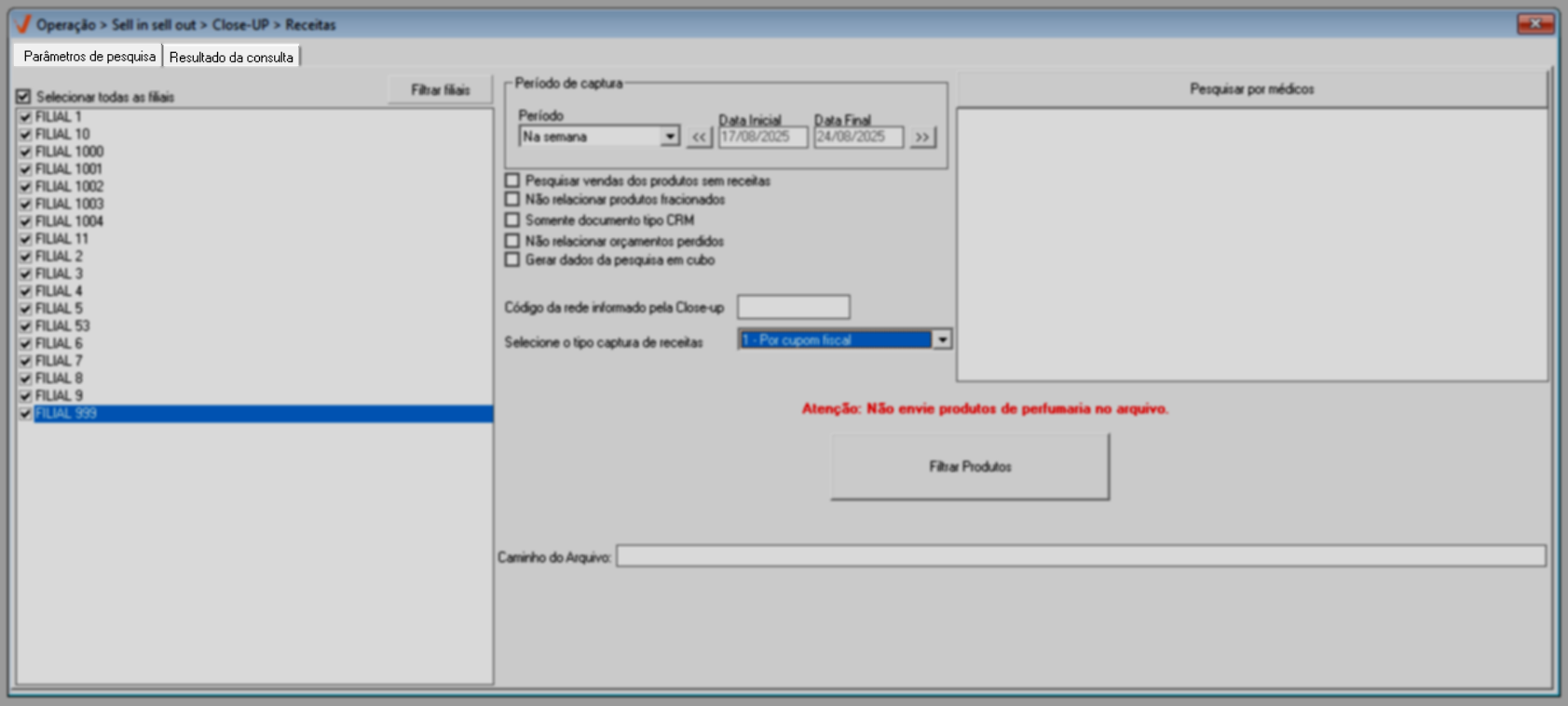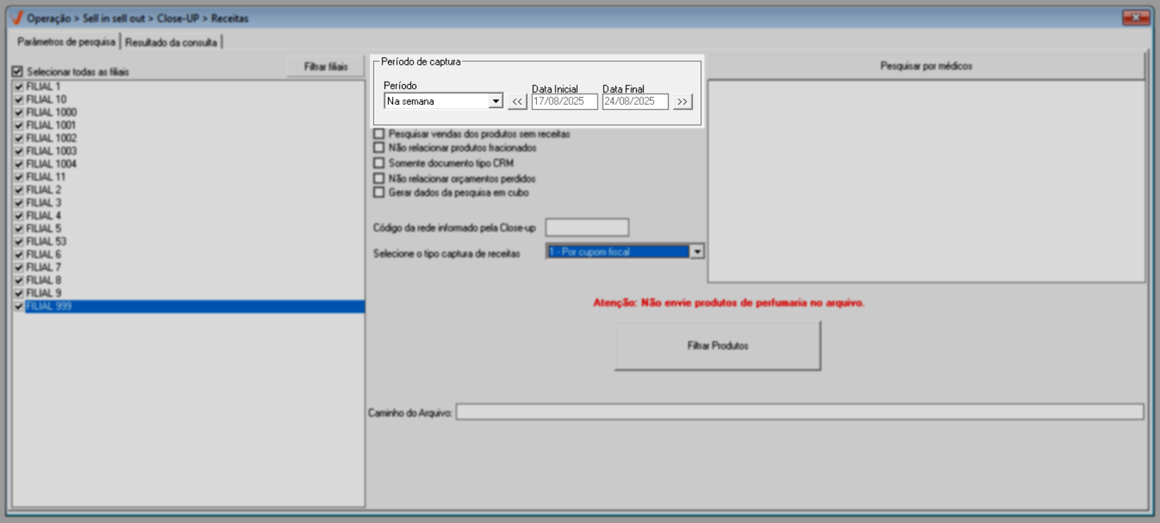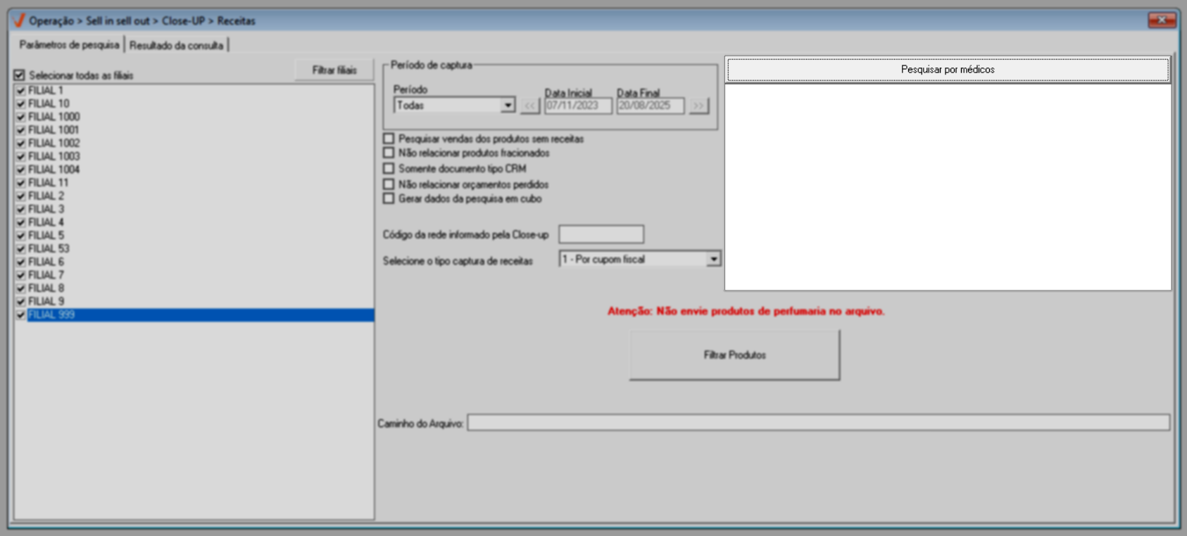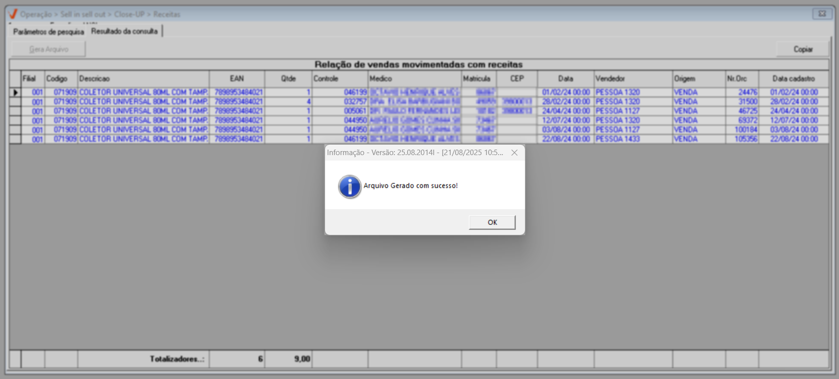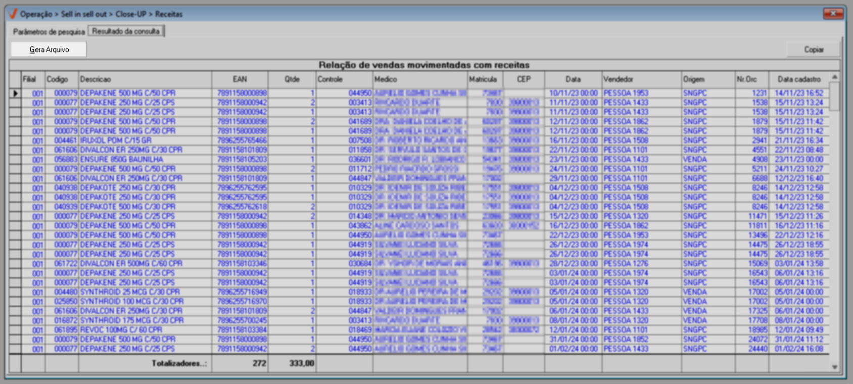Nesta tela, o sistema possibilita a geração de arquivos de acordo com a estrutura da empresa parceira Close-up, para o envio das informações de Sell-in e Sell-out, com base nas vendas realizadas mediante receita médica.