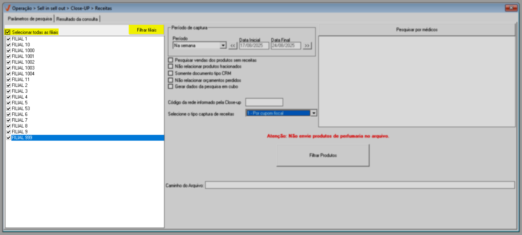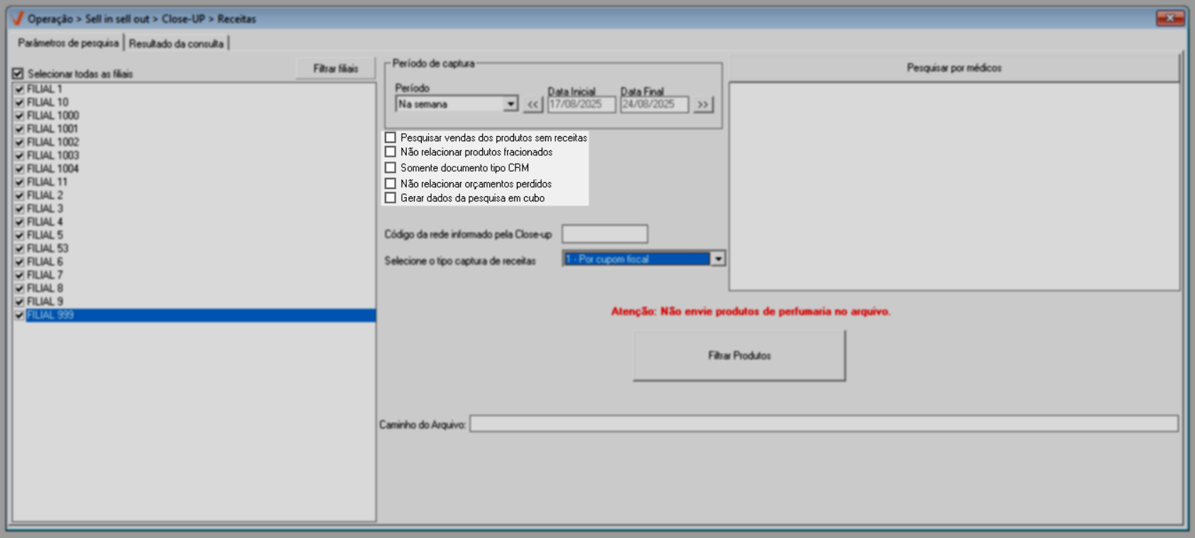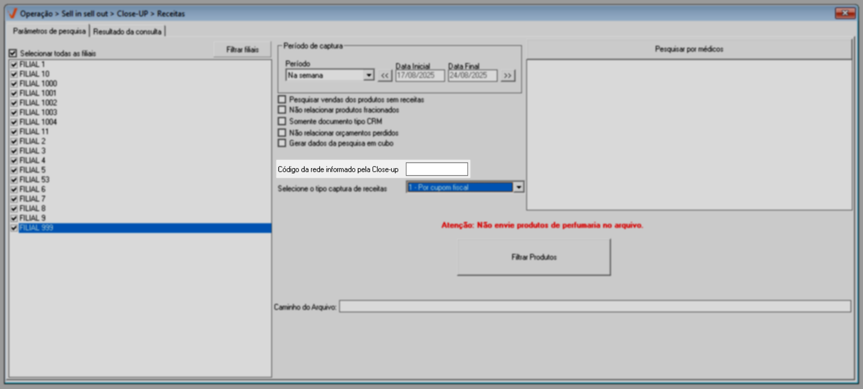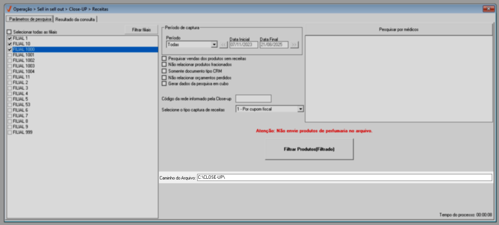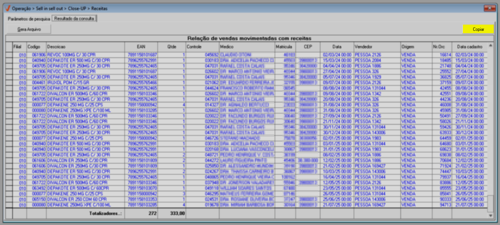 Nesta tela, o sistema possibilita a geração de arquivos de acordo com a estrutura da empresa parceira Close-up, para o envio das informações de Sell-in e Sell-out, com base nas vendas realizadas mediante receita médica.