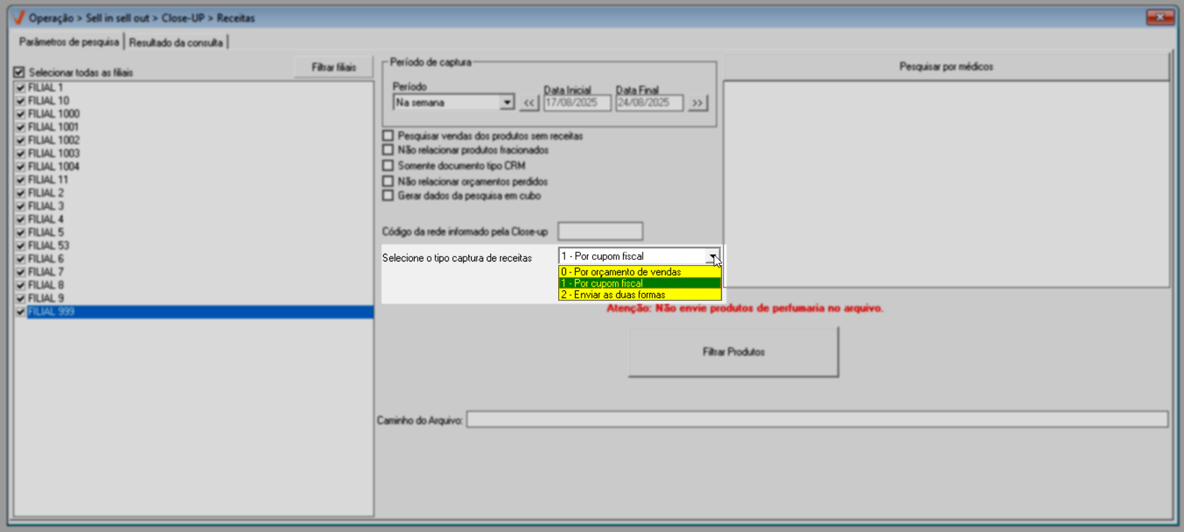 - Para que o arquivo seja gerado com base nas receitas capturadas, é essencial que as informações tenham sido devidamente registradas durante o lançamento da venda no módulo orçamento. Recomenda-se ainda incluir apenas produtos do tipo medicamento, pois essa seleção garante que o arquivo seja mais alinhado com as necessidades da empresa parceira.