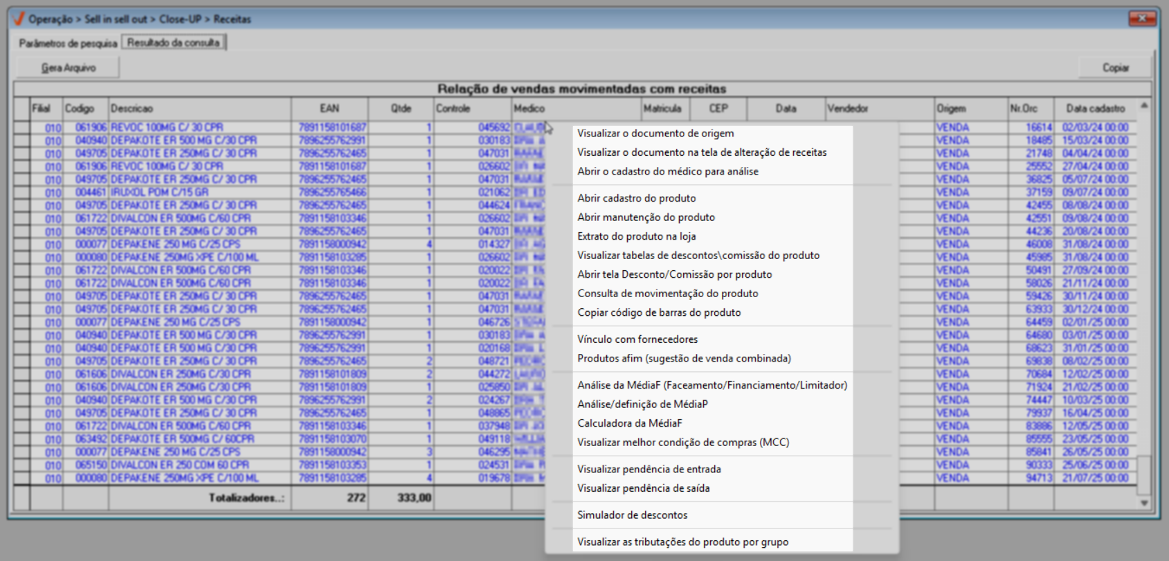 O sistema ainda disponibiliza diversas opções estratégicas ao clicar com o botão auxiliar do mouse sobre o produto selecionado. Essas opções variam conforme o tipo de captura de receitas escolhido na aba "Parâmetros de pesquisa". Uma funcionalidade que oferece maior rastreabilidade dos produtos é a opção "Visualizar o documento de origem", que permite acessar o documento original relacionado à venda.