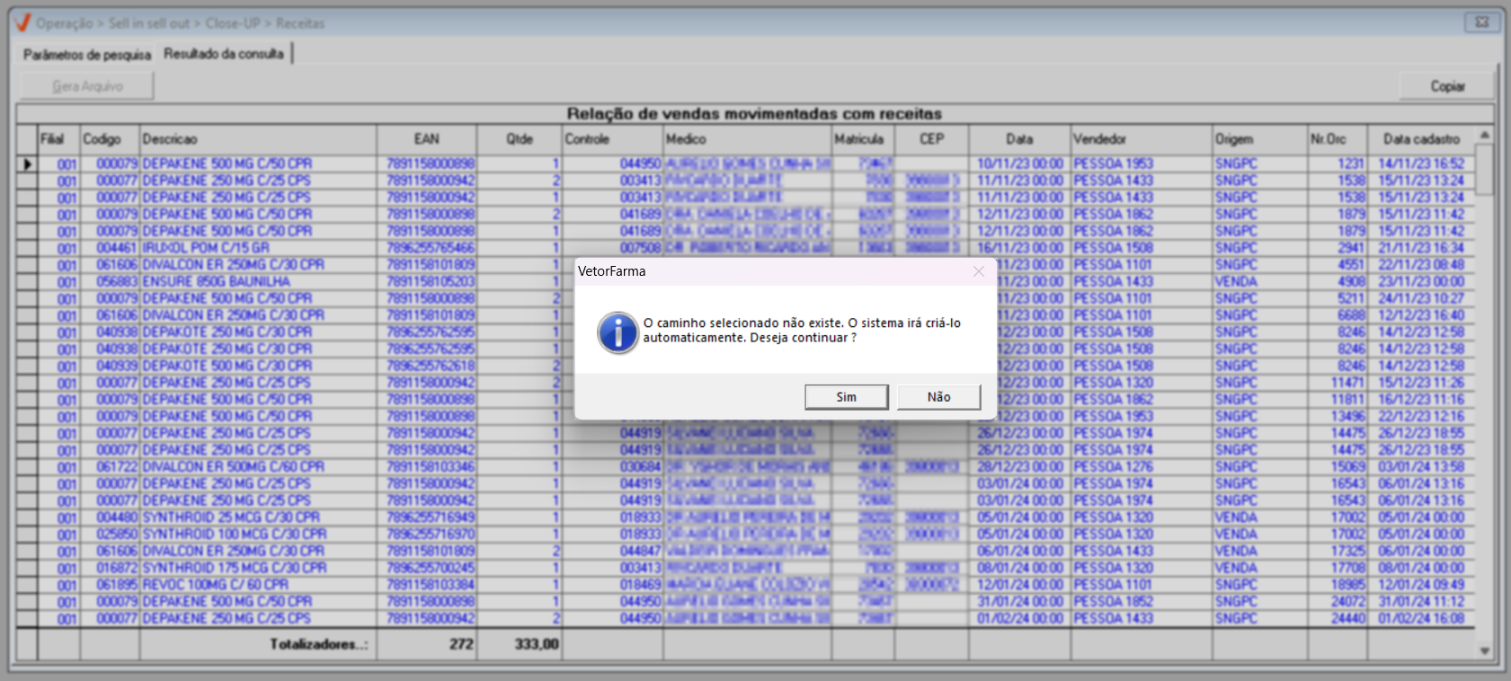 Em seguida, se o usuário especificou um local para salvar o arquivo, ele será armazenado lá. Caso contrário, o sistema o salvará por padrão no seguinte caminho: C:\CLOSE-UP. Após a confirmação do caminho, será exibida a mensagem: "O caminho selecionado não existe. O sistema ira criá-lo automaticamente. Deseja continuar?". Para finalizar, selecione >> Sim para gerar o arquivo.