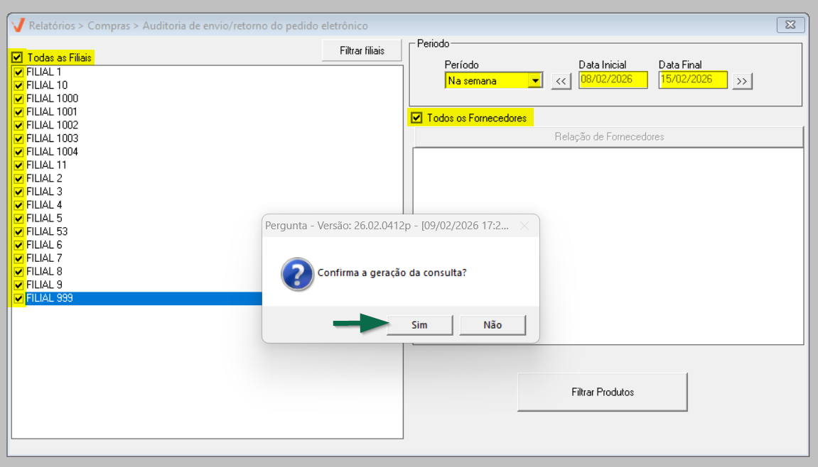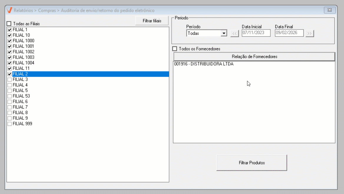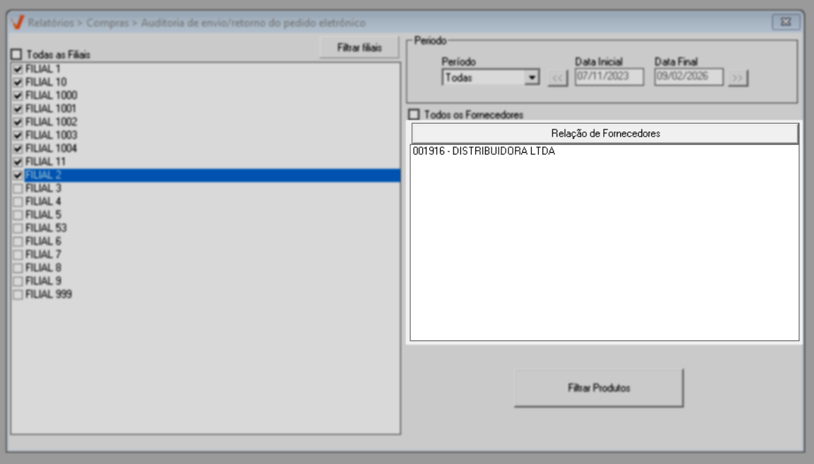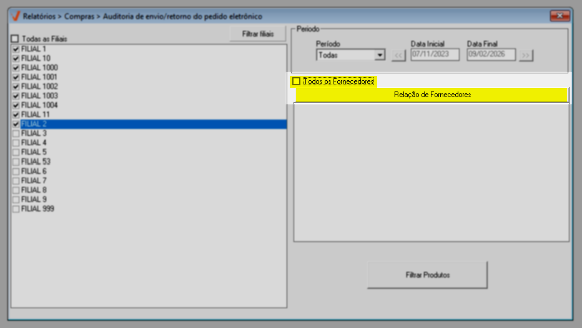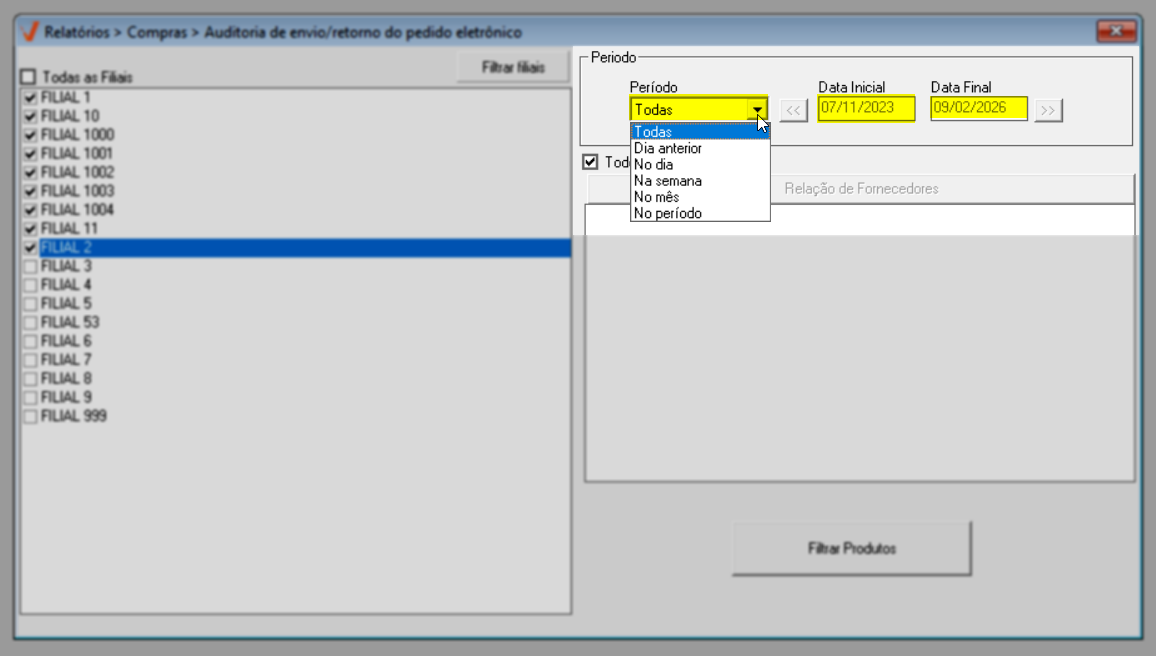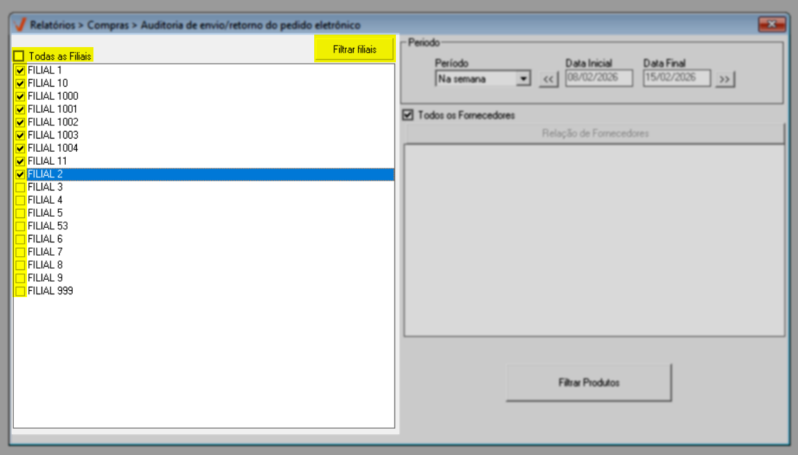 Ao abrir a tela, perceba que ela é dividida em duas seções, facilitando a organização dos filtros de personalização da consulta. Para simplificar a emissão do relatório, o sistema sugere a configuração de alguns filtros para a busca de registros de envio/retorno de pedidos eletrônicos, incluindo: a busca todas as filiais disponíveis, o período da semana atual e todos os fornecedores. Para considerar essa sugestão, basta pressionar o atalho >> F2 e confirmar a mensagem apresentada em seguida para emitir o relatório. Caso prefira, personalize os filtros conforme sua necessidade. Continue a leitura para aprender como realizar as personalizações.
