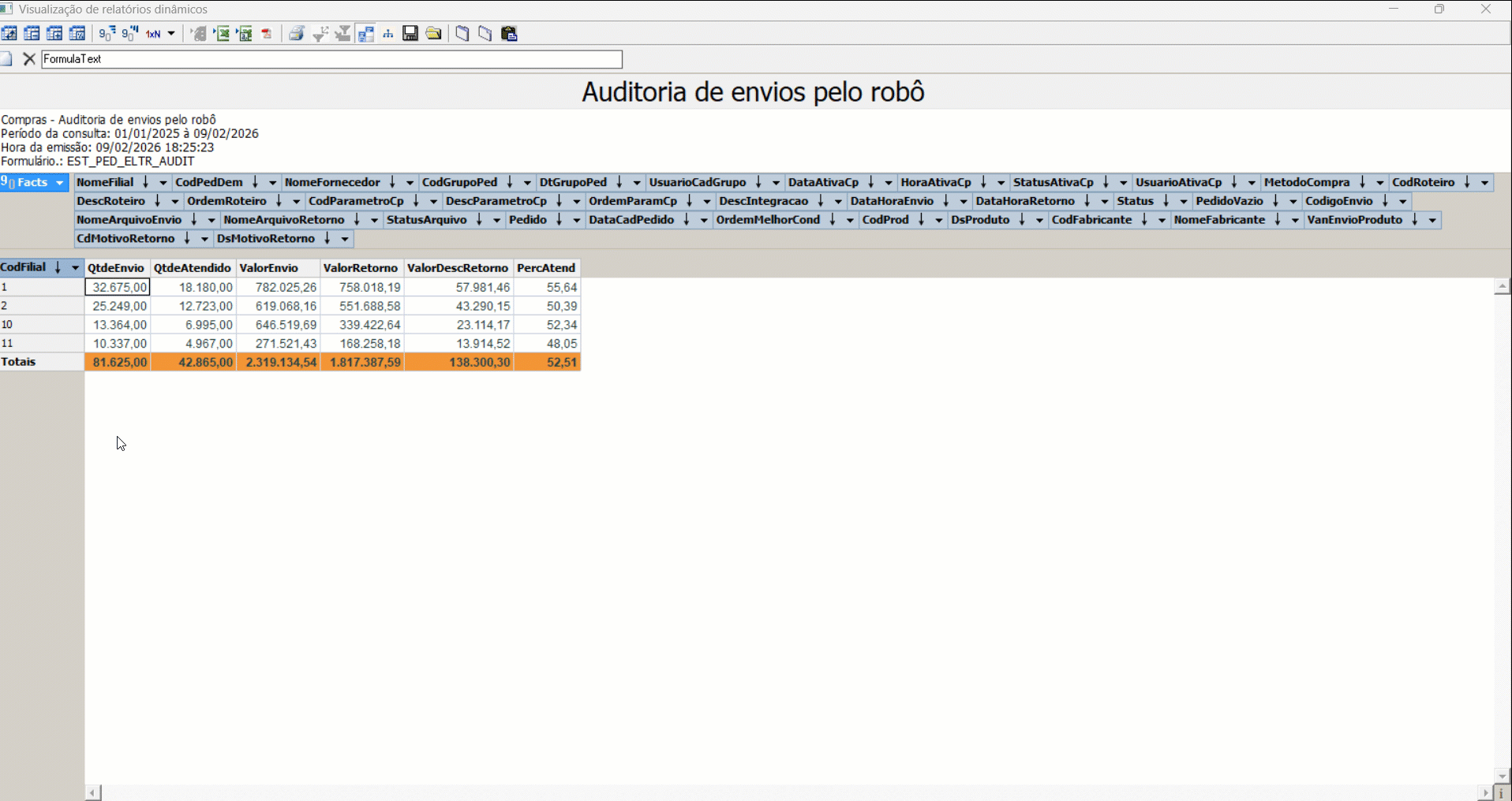 O relatório dinâmico pode ser personalizado pelo usuário, exibindo as informações que ele desejar visualizar. Contudo, para aprimorar a análise, é recomendável incluir no relatório os códigos e descrições dos motivos de retorno do pedido eletrônico, conforme o código retornado no arquivo. Esses motivos são cadastrados na tela “EDI – Electronic Data Interchange (Intercâmbio Eletrônico de Dados) da Pessoa” e indicam as situações que podem ser retornadas na linha dos produtos durante o processamento do pedido eletrônico. Eles têm como finalidade informar os usuários, especialmente o departamento de compras, sobre o status do pedido. Dessa forma, é possível identificar, por exemplo, pedidos não atendidos por não atingimento do pedido mínimo, indisponibilidade de produto, ausência de identificação do item no fornecedor, entre outras situações que indicam o atendimento ou não do pedido. Clique aqui para acessar a documentação dessa tela e conferir todos os detalhes.