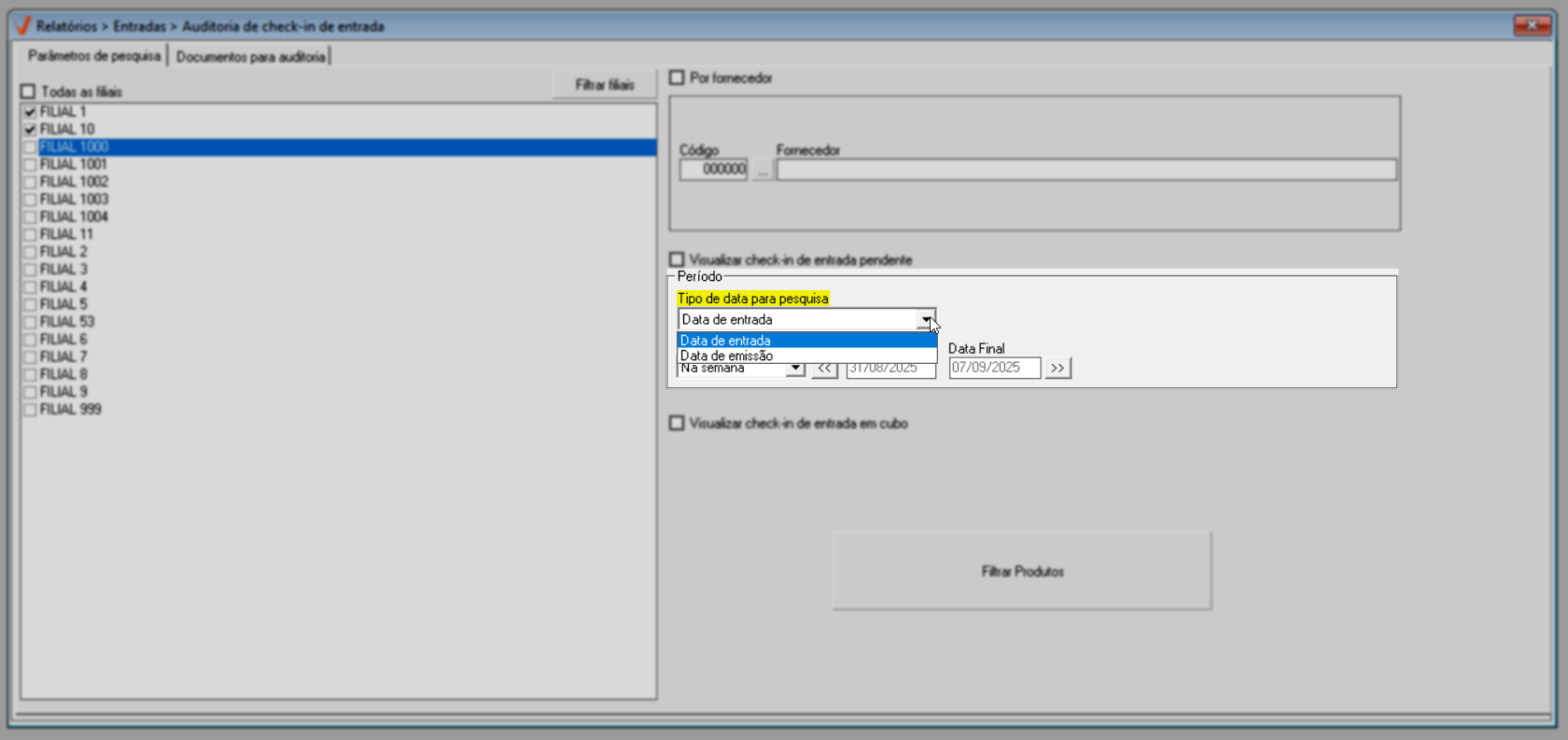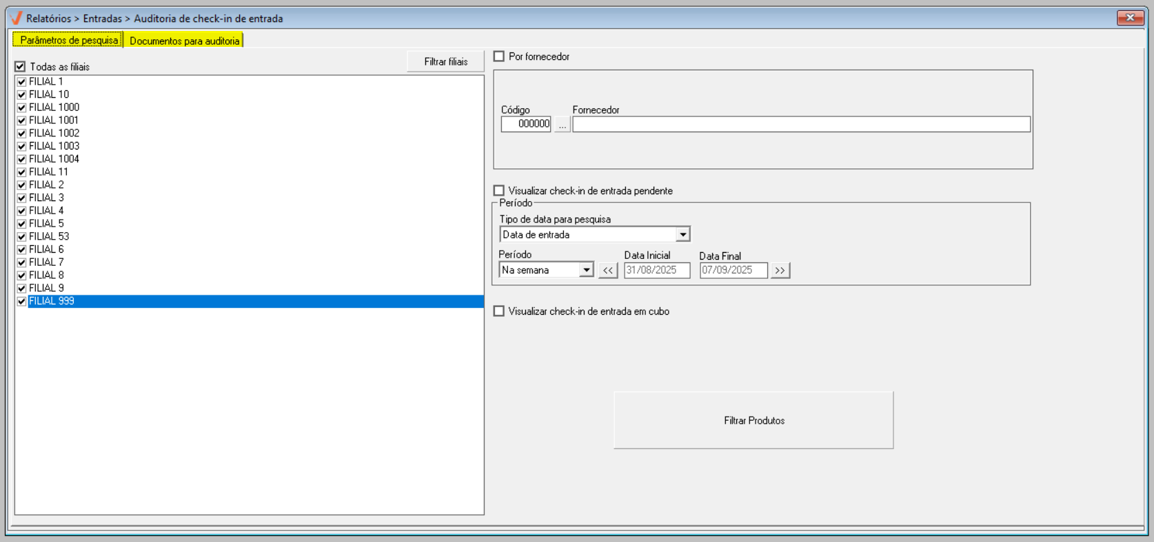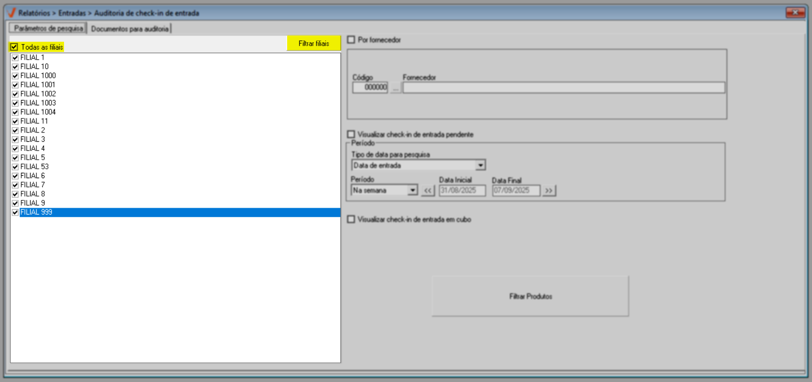 A consulta das informações será feita com base na filial de entrada da nota fiscal, portanto, é necessário selecionar ao menos uma filial para que a consulta seja possível. O sistema sugere a seleção de todas as filiais disponíveis. Mantenha a sugestão, ou desmarque a opção "Todas as filiais" e marque apenas as de interesse.