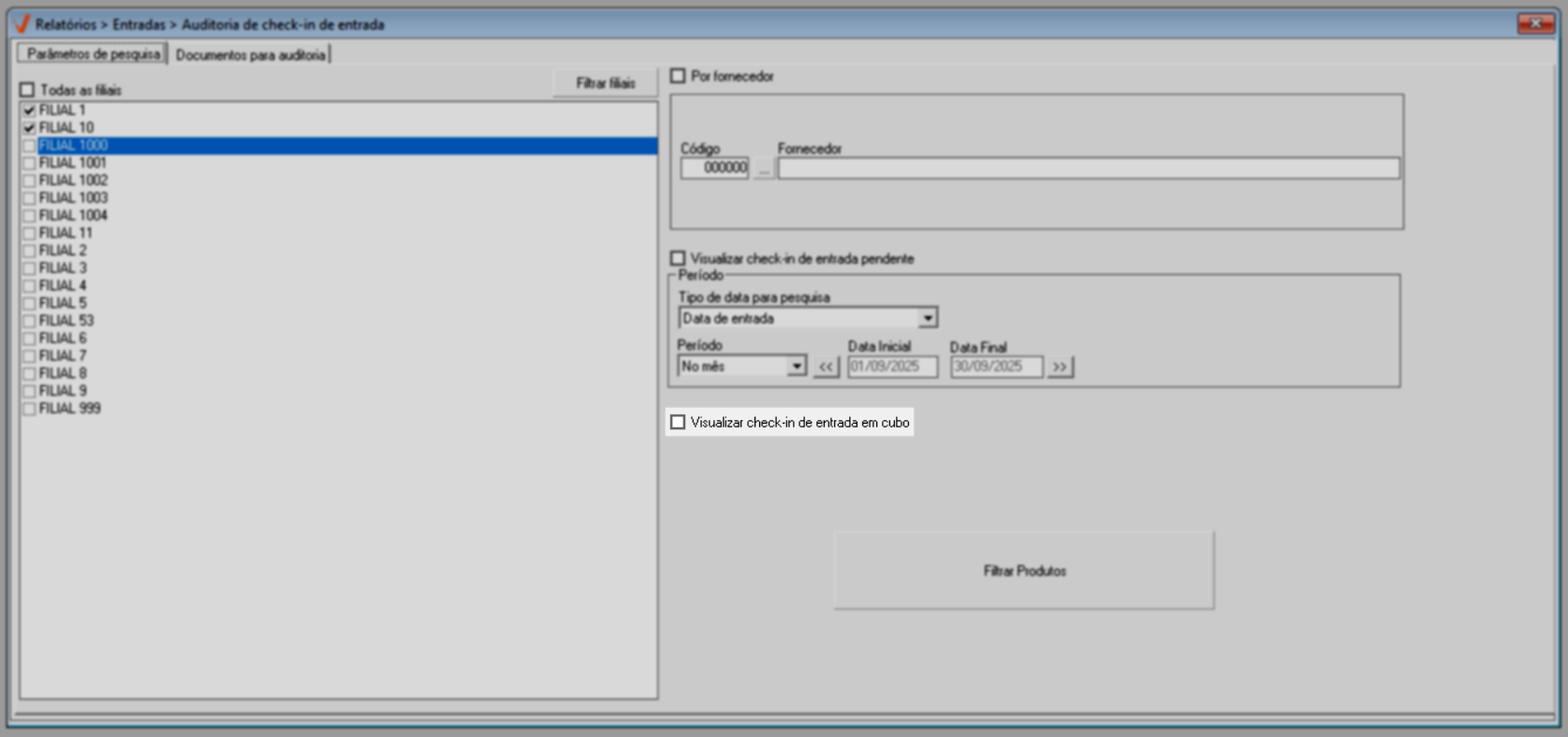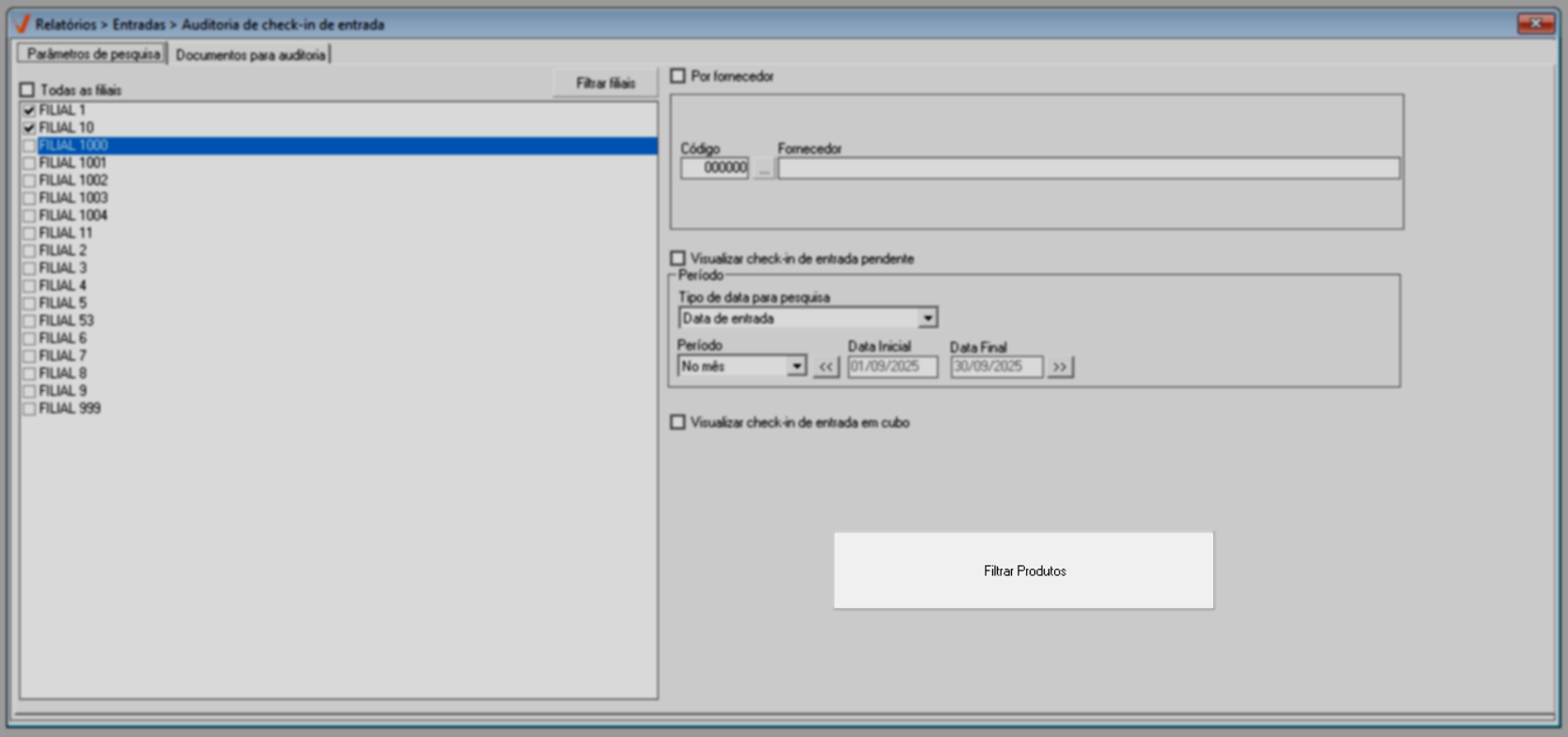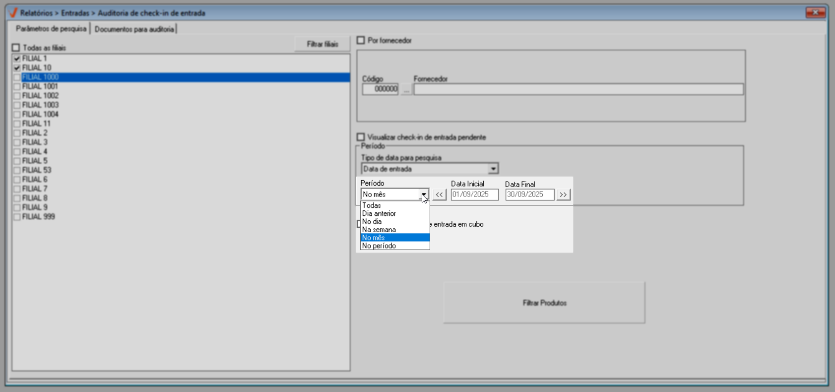 A consulta das informações será feita com base na filial de entrada da nota fiscal, portanto, é necessário selecionar ao menos uma filial para que a consulta seja possível. O sistema sugere a seleção de todas as filiais disponíveis. Mantenha a sugestão, ou desmarque a opção "Todas as filiais" e marque apenas as de interesse.