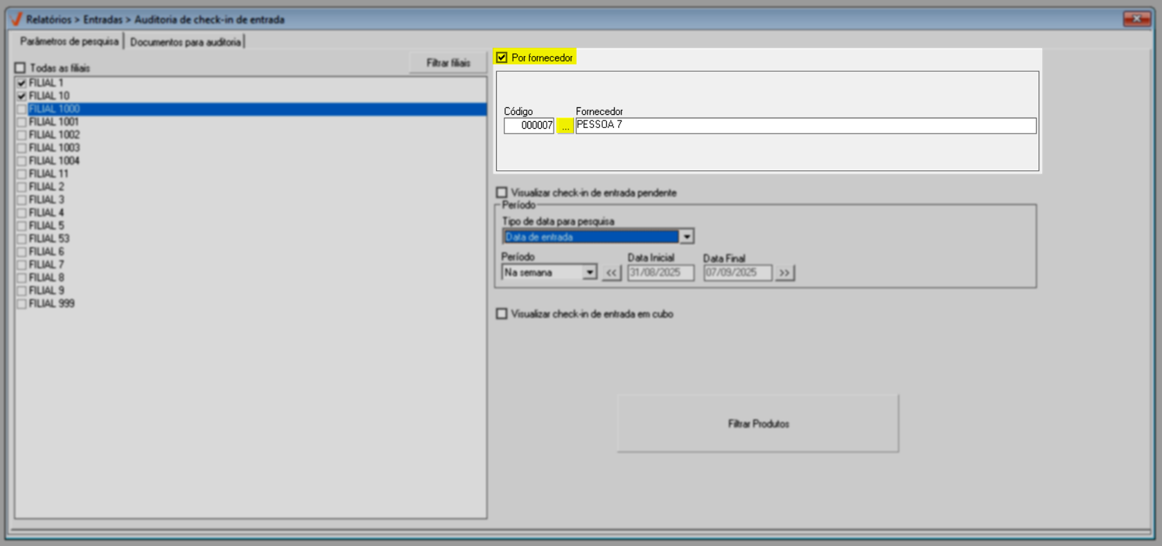 A seguir, se desejar manter a configuração padrão dos demais filtros da tela, tecle o atalho F6 para buscar as notas fiscais de todos os fornecedores disponíveis, considerando a data de entrada do documento e o período da semana atual. Caso existam documentos para visualização, eles serão revelados na aba "Documentos para auditoria". Por outro lado, se preferir refinar as informações do relatório, continue personalizando os filtros.