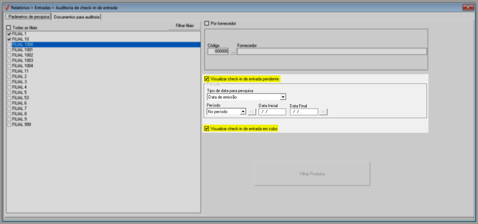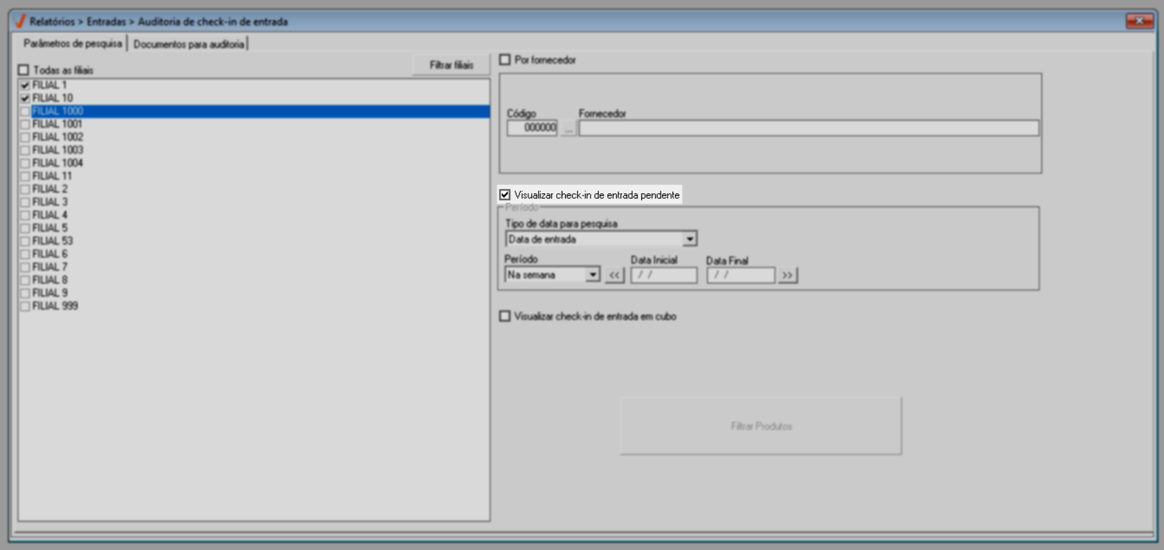 Ao combinar as opções "Visualizar check-in de entrada pendente" e "Visualizar check-in de entrada para impressão ", o sistema exibirá na aba "Documentos para auditoria" todos os documentos pendentes de entrada e aqueles que não tiveram o check-in finalizado independente do período. Por outro lado, se a opção "Visualizar check-in de entrada pendente" não for marcada, o sistema revelará todos os documentos abrangendo os pendentes, aqueles que tiveram o check-in finalizado e os que ainda não tiveram o check-in concluído, no entanto considerando o período informado.