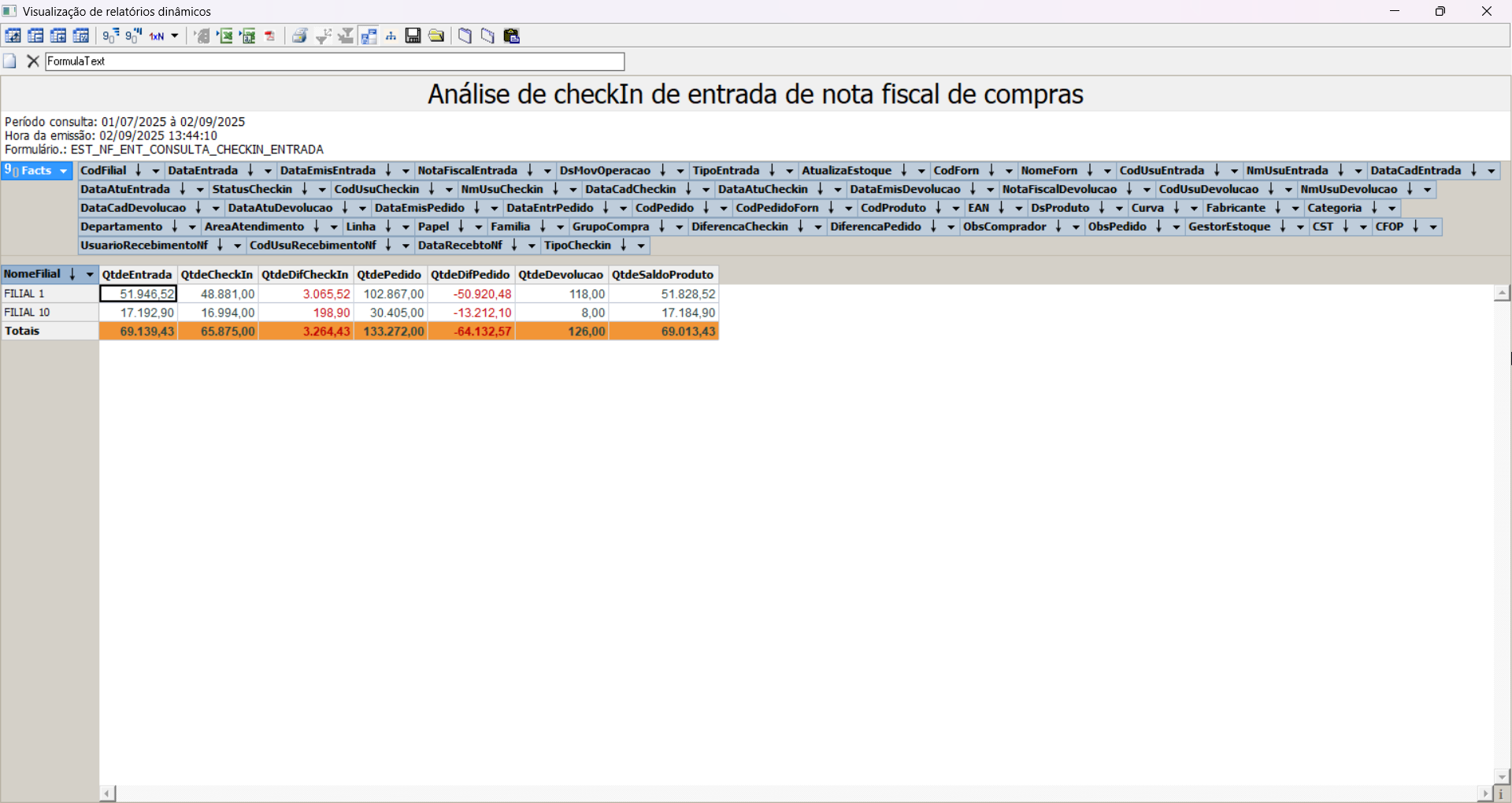 Este modelo de relatório foi desenvolvido para oferecer aos usuários a possibilidade de auditar e monitorar os registros de Check-in de entrada, abrangendo os pendentes, aqueles que foram finalizados e os iniciados mas que ainda não foram concluídos. A estrutura do relatório pode ser baseada no formato "Cubo Dinâmico", que oferece uma visualização mais detalhada dos dados dos documentos encontrados. Esse formato permite que o usuário personalize as informações do relatório conforme interesse. Além disso, o relatório pode ser visualizado diretamente na própria tela, em uma aba específica, onde o usuário pode visualizar apenas as informações escolhidas pelo sistema consideradas mais relevantes, no entanto, com a opção de incluir a visualização da nota fiscal de origem, possibilitando identificar se o processo foi realizado via Check-in de Entrada ou Check-in por Volume. Com isso, o relatório proporciona maior rastreabilidade, controle operacional e facilita tanto o acompanhamento quanto a auditoria das operações.