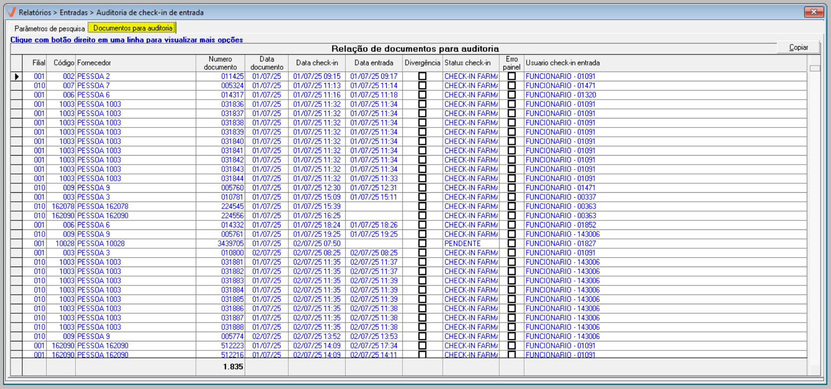 - Usuário check-in entrada: Divulgará o usuário que efetivou o check-in dos produtos no sistema.