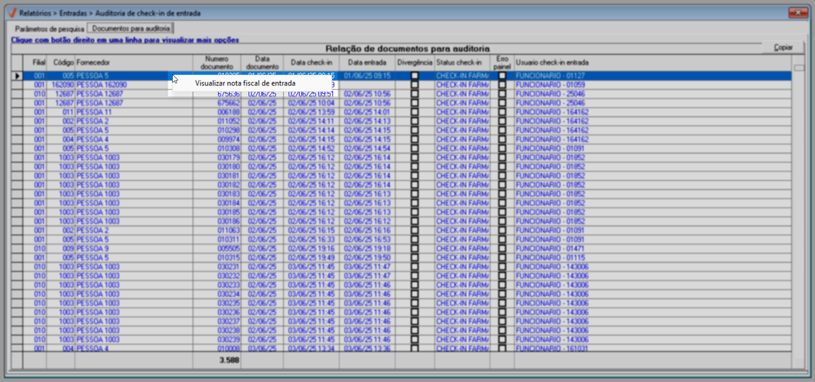 - Acesse o menu: Relatórios >> Entradas >> Auditoria de Check-in de entrada.