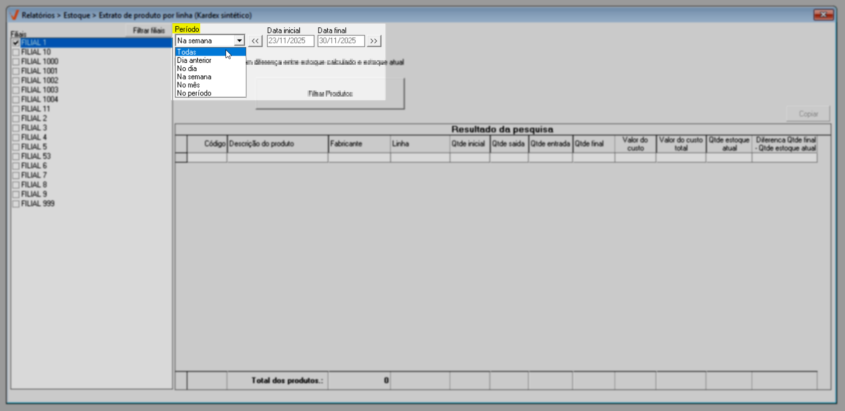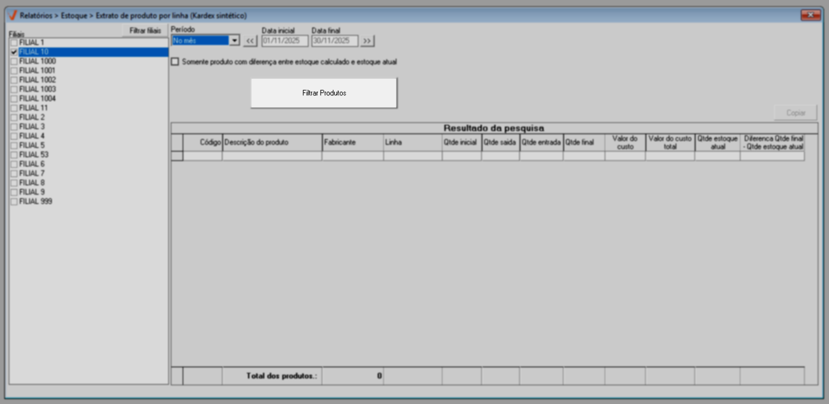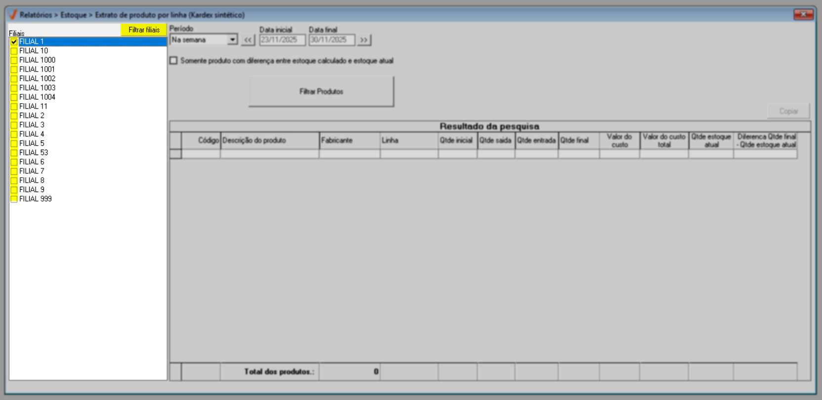- Acesse o menu: Relatórios >> Estoque >> Extrato de produto por linha (Kardex sintético).