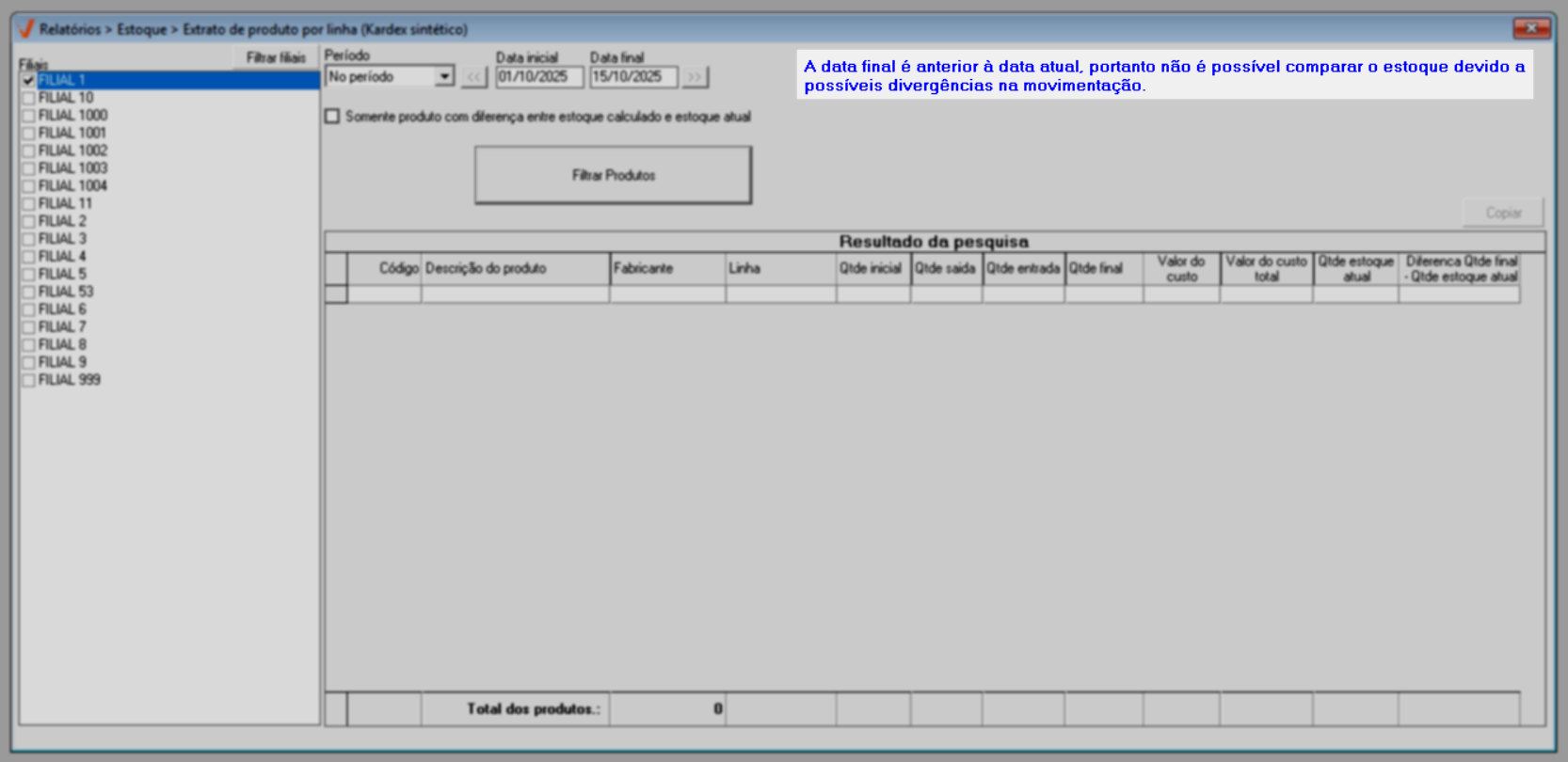 - Quantidade inicial: Saldo inicial do produto (considerando a data inicial informada);