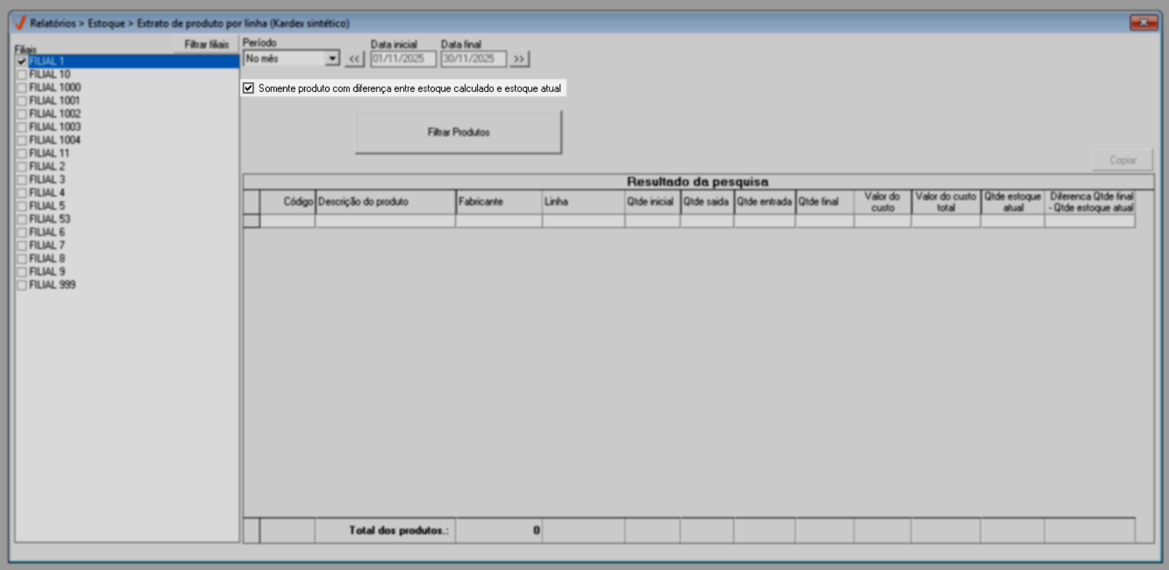 A opção “Somente produtos com diferença entre estoque calculado e estoque atual”, quando habilitada, exibirá nos resultados apenas os produtos que apresentam divergência entre o estoque final calculado pelas movimentações e o estoque atual registrado no sistema. Essas diferenças podem ser identificadas e corrigidas diretamente na tela “Relatório: Extrato de Produtos (Kardex)”. Clique aqui para aprender mais sobre esse processo.