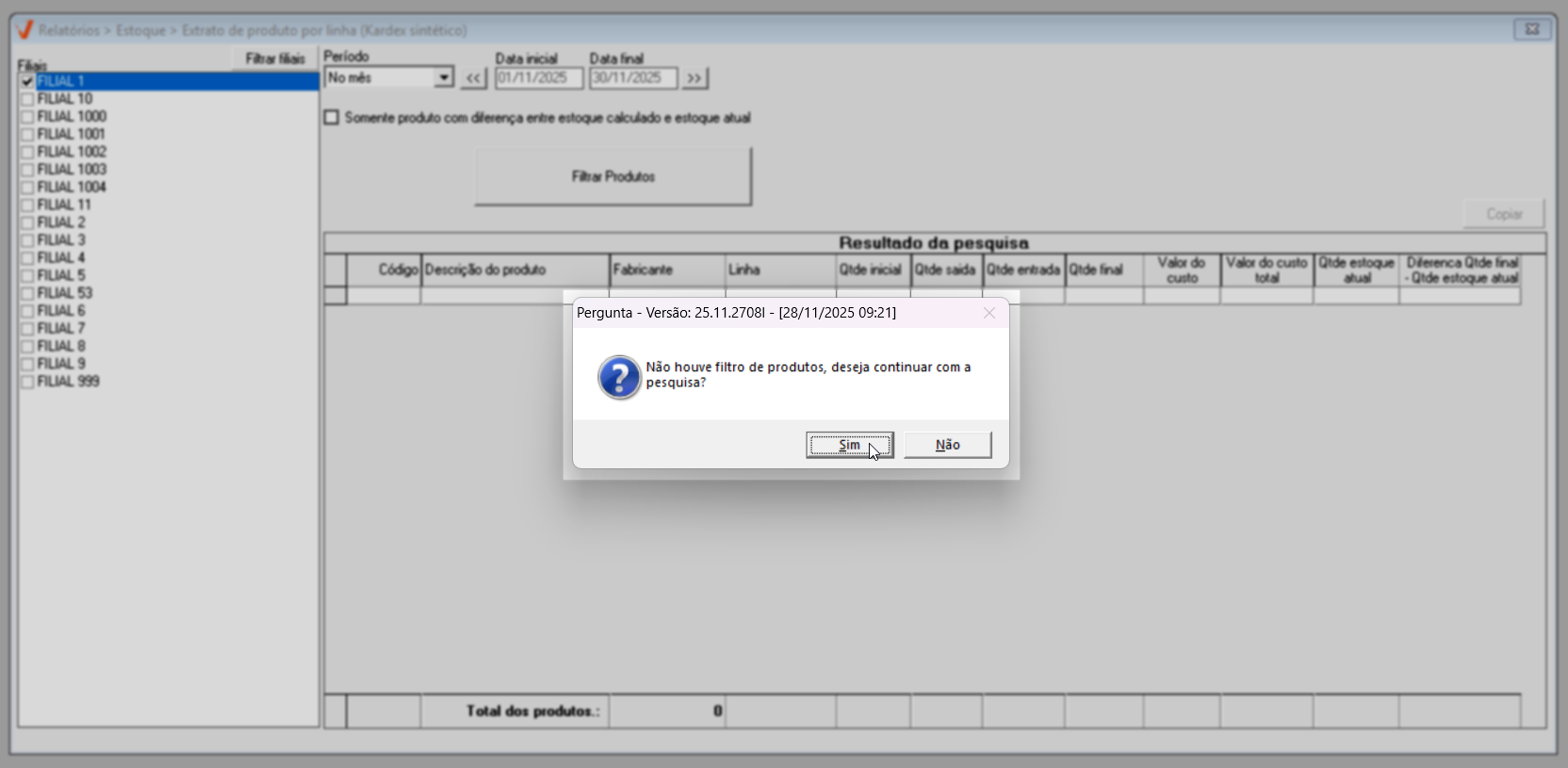 Definidos os parâmetros de pesquisa, caso a intenção seja gerar um relatório com todos os produtos, tecle o atalho F6. Em seguida, será apresentada a mensagem "Não houve filtro de produtos, deseja continuar com a pesquisa?", clique em >> Sim para gerar o resultado.