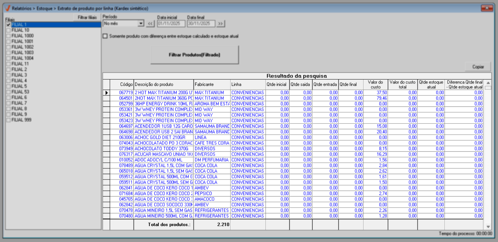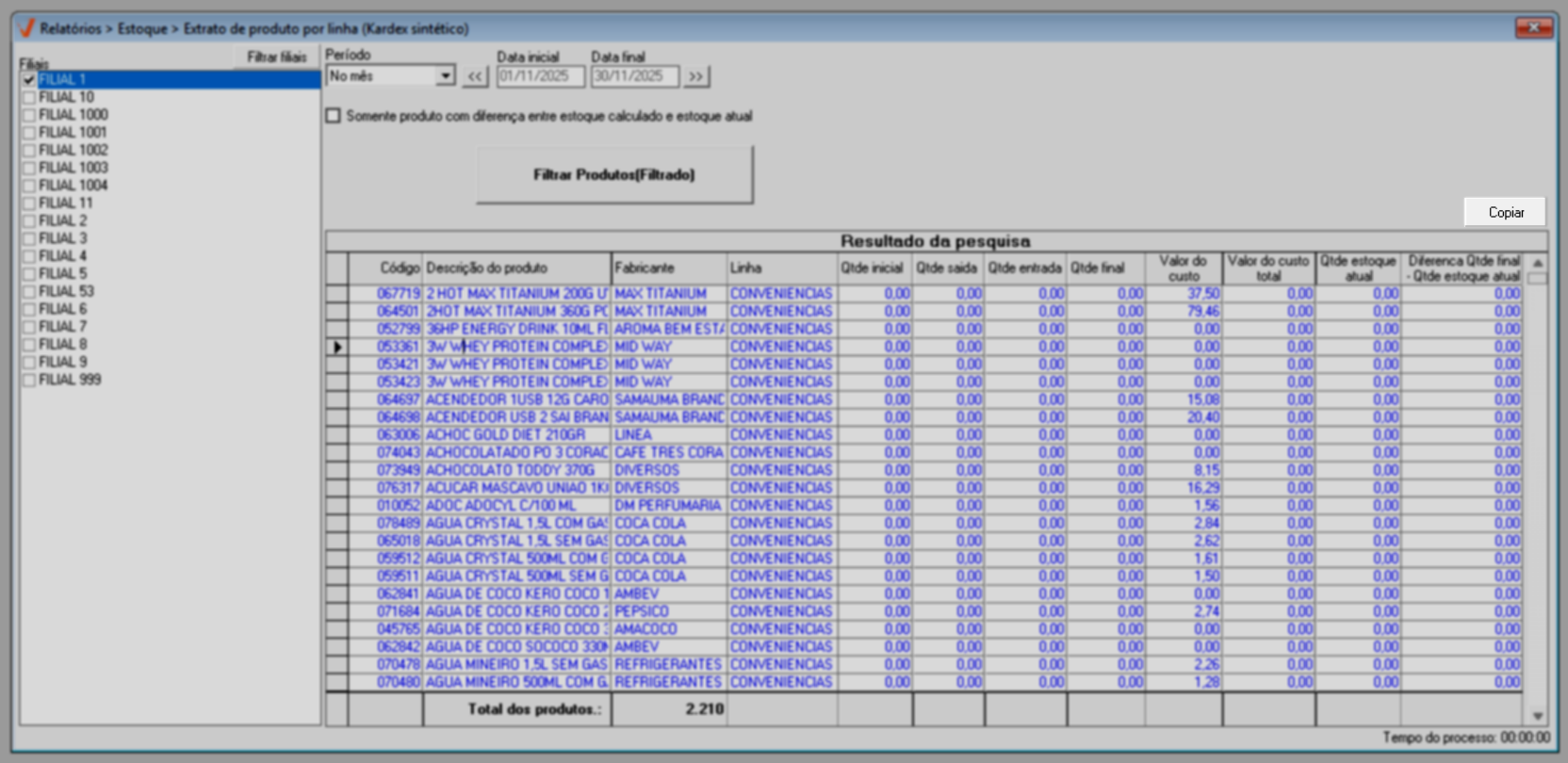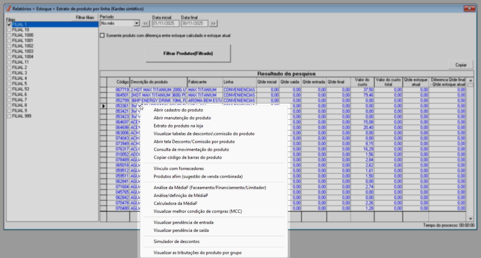 1º Passo – Gerar relatório extrato de produto por linha (Kardex sintético)
