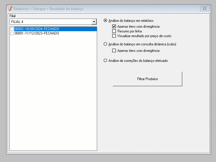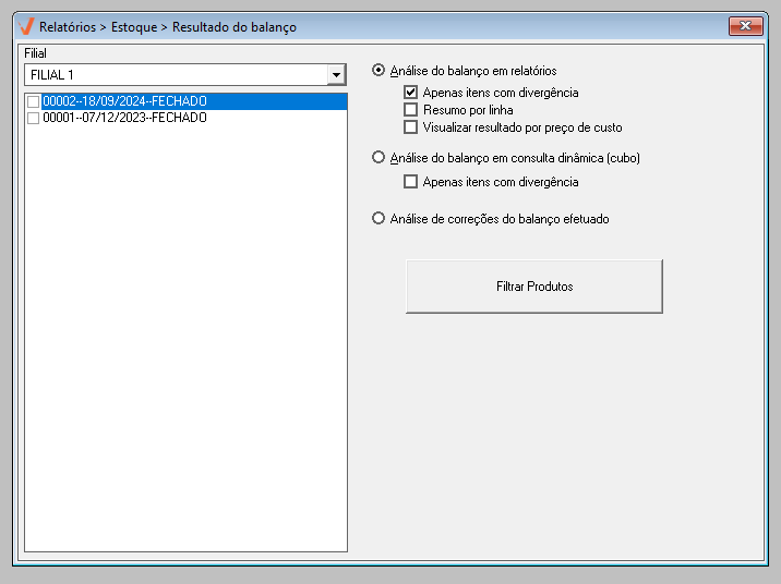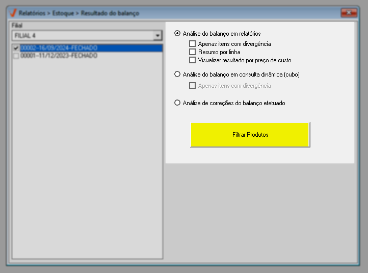 Ao abrir a tela do "Relatório: Resultado do Balanço", você encontrará duas seções principais, organizadas lado a lado, que dividem as opções de forma clara e exibindo os filtros que serão utilizados para a geração do relatório. À esquerda, é possível selecionar a filial desejada e, em seguida, o resultado de balanço que se deseja visualizar. À direita, o usuário pode escolher o tipo de relatório a ser gerado e aplicar um filtro de produtos, que limita o resultado apenas aos itens selecionados. A seguir, veja como utilizar as funcionalidades da tela para gerar o relatório.