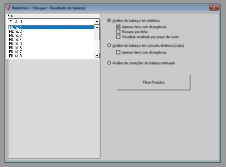 Comece informando, no campo "Filial", a loja na qual deseja gerar o resultado do balanço.