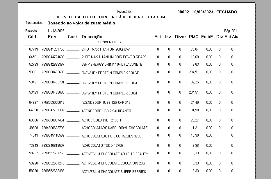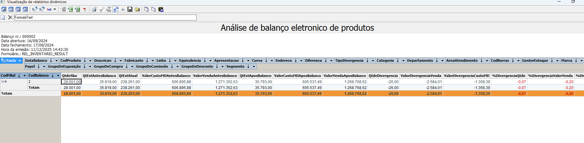 - Análise de correção do balanço efetuado: O relatório apresenta uma visualização dos dados do inventário após o processo de correção.