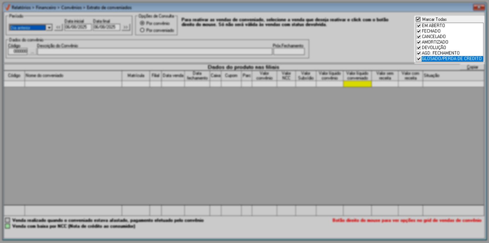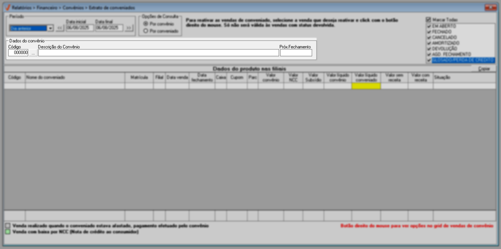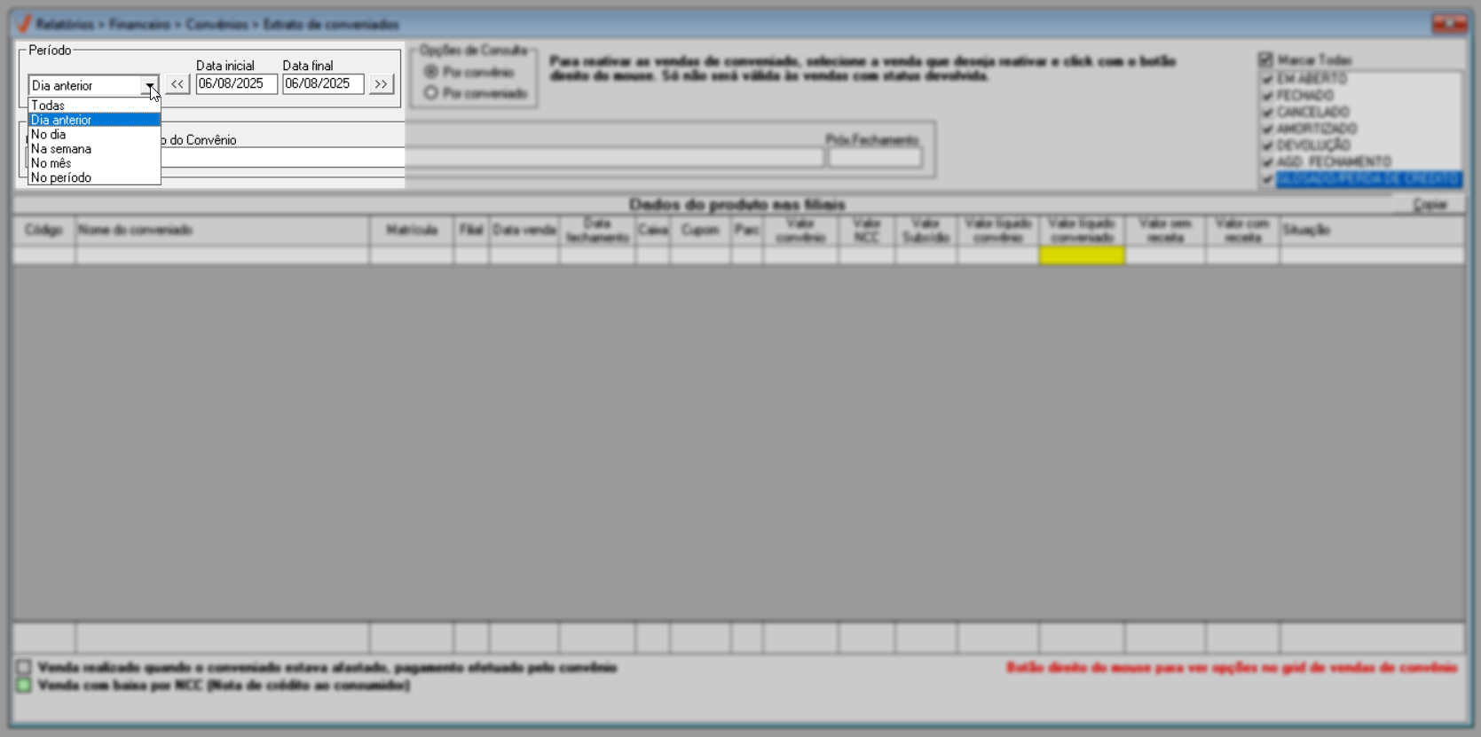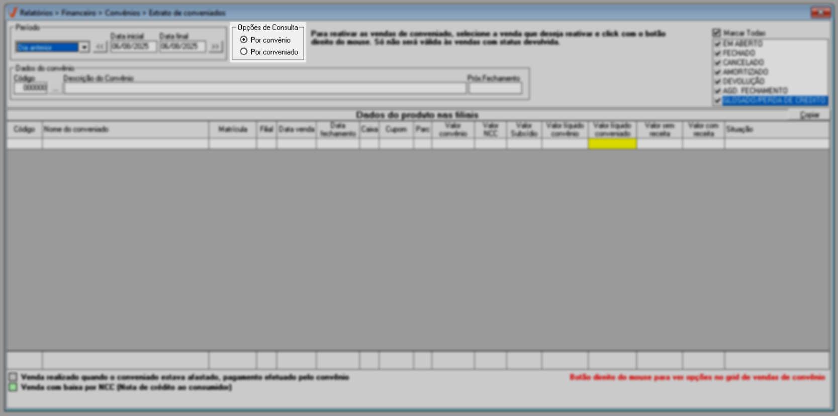 - Acesse o menu Relatórios >> Financeiro >> Convênios >> Extrato de conveniados.