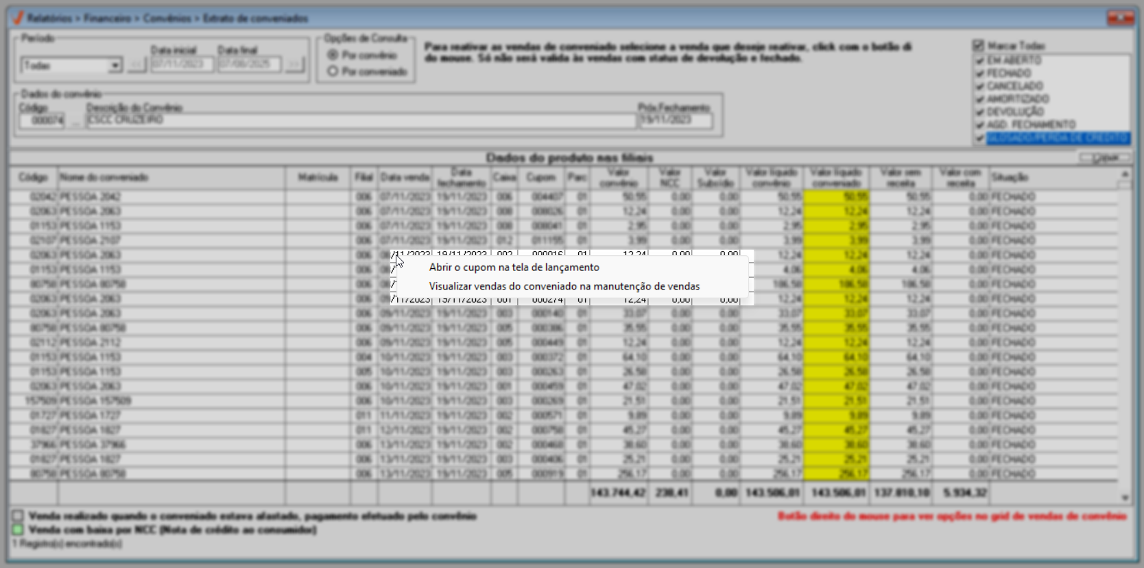Se as vendas efetuadas forem com base no tipo de consulta "Por conveniado", o sistema oferece ao usuário duas opções de atalho a outras telas do sistema. Essas opções são reveladas ao clicar com o botão direito do mouse sobre o lançamento desejado: