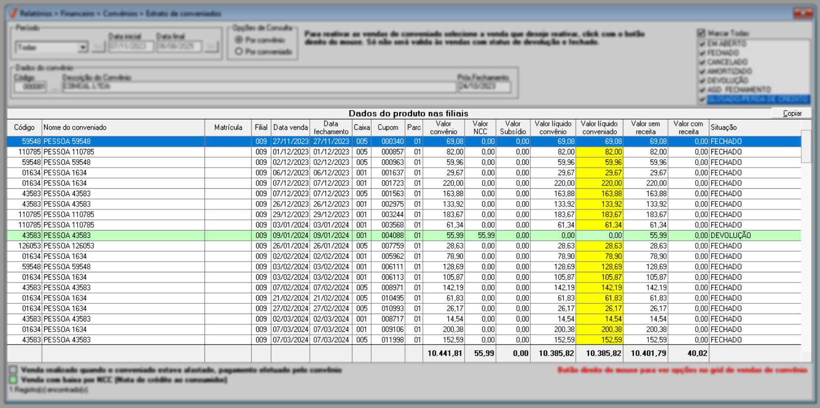 - Amarelo: Indicará as vendas efetuadas pelo cliente antes de se tornar um conveniado do convênio atual.