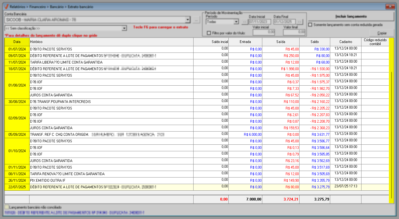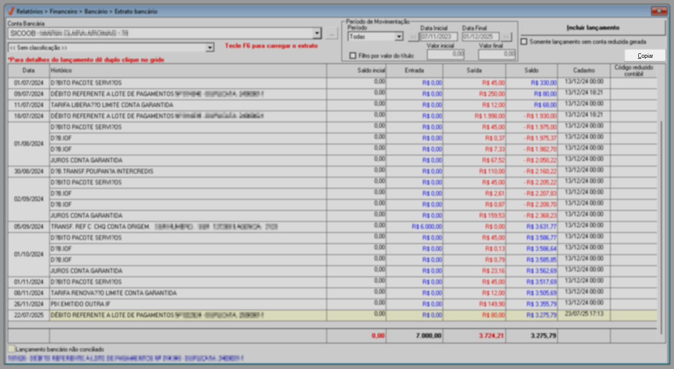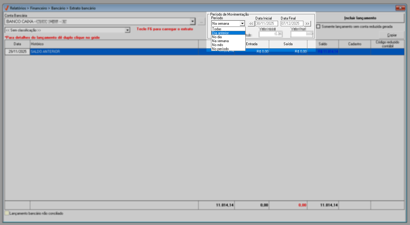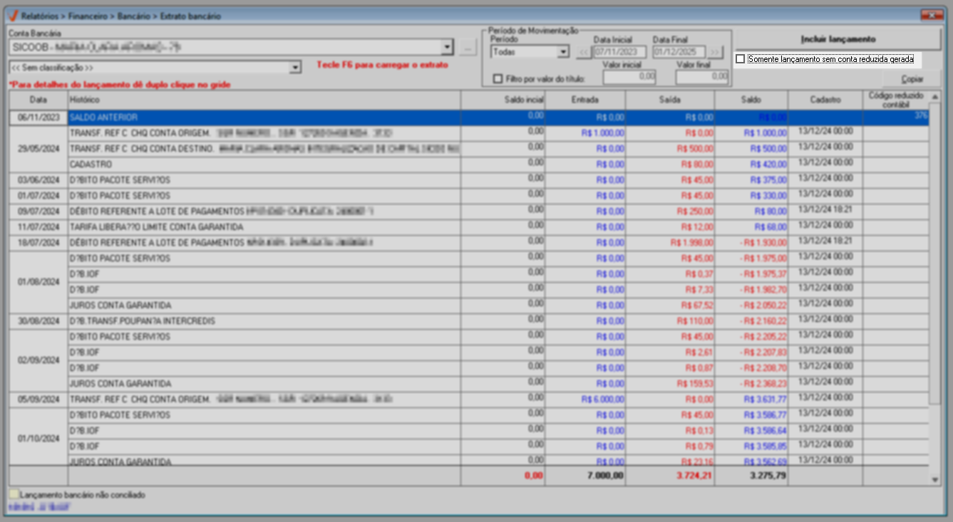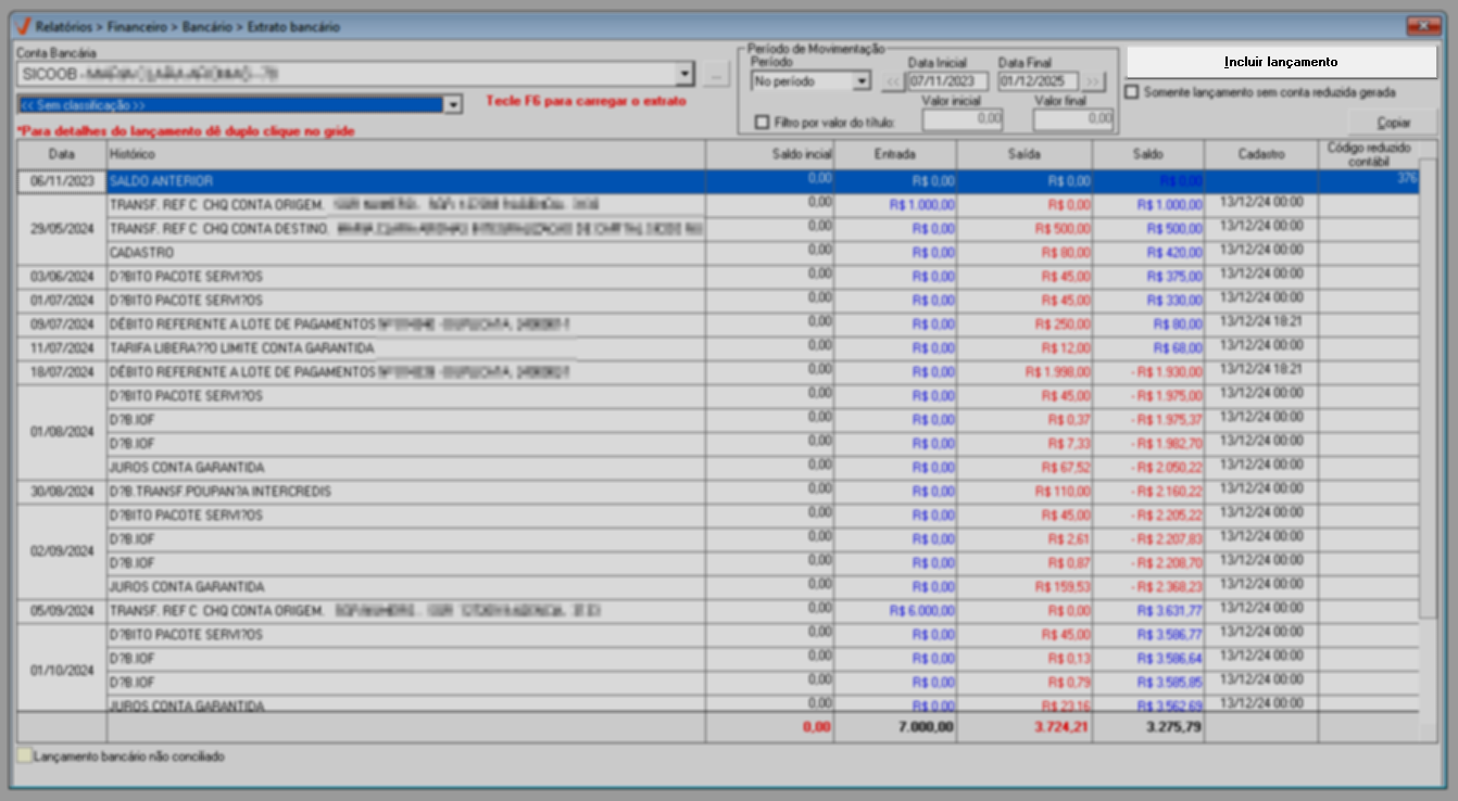 Após personalizar os filtros de interesse, tecle o atalho F6 para realizar a busca. Após, o sistema apresentará todos os lançamentos encontrados, ou seja, "Saldo inicial", "Entradas" (créditos), "Saídas" (débitos) e "Saldos" na seção abaixo: