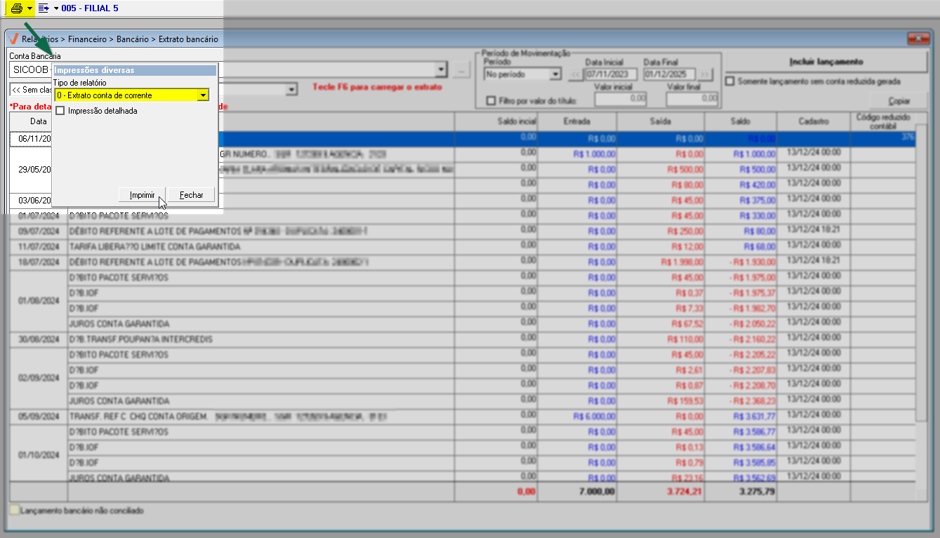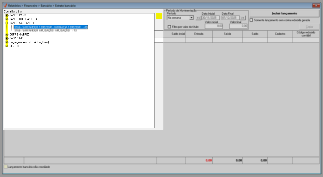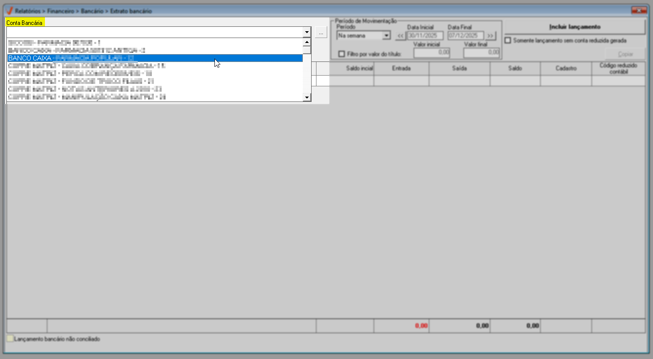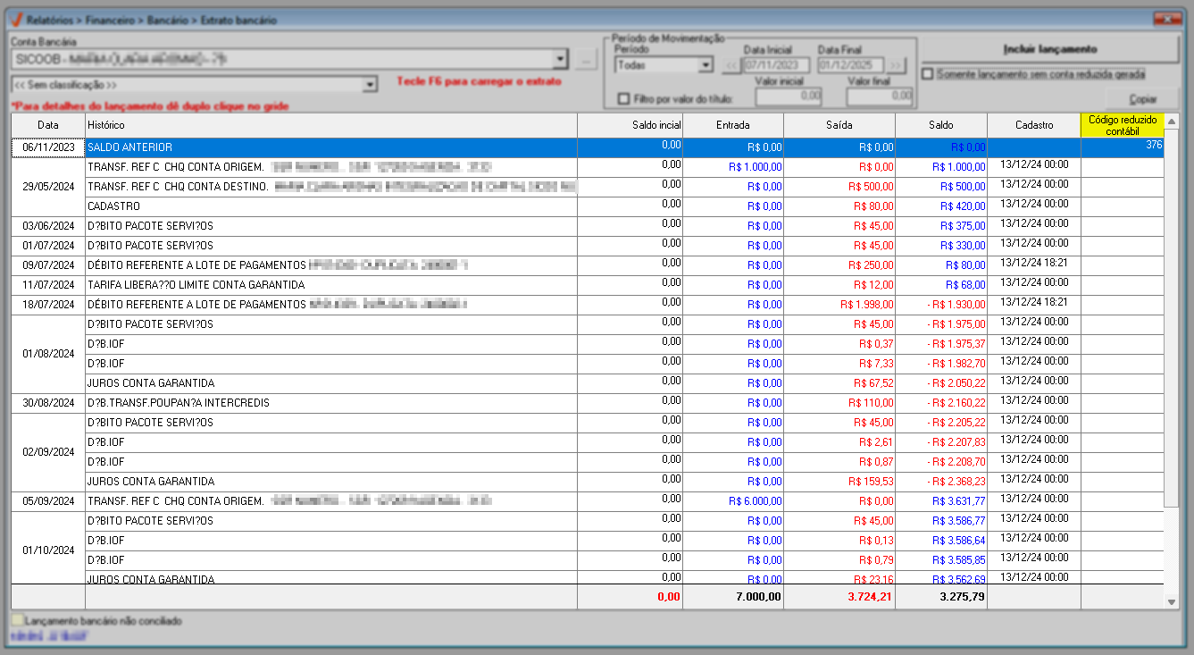 Após personalizar os filtros de interesse, tecle o atalho F6 para realizar a busca. Após, o sistema apresentará todos os lançamentos encontrados, ou seja, "Saldo inicial", "Entradas" (créditos), "Saídas" (débitos) e "Saldos" na seção abaixo: