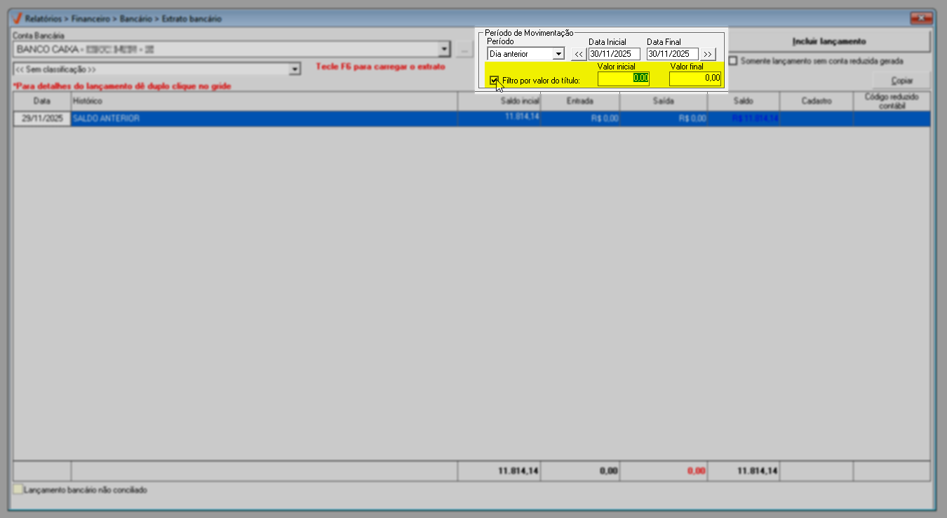 Além disso do filtro por período , há a opção de filtro "Filtro por valor do título", que possibilita a pesquisa de lançamentos bancários com base em valores monetários. Para isso, basta clicar na opção "Filtro por valor do título" e informar os valores mínimo e máximo nos campos "Valor inicial" e "Valor final", respeitando o período previamente selecionado.