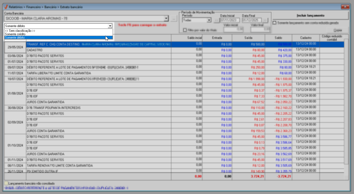 O sistema permitirá que o usuário consulte as informações separadamente, isto é, somente os créditos ou débitos. Utilize a seção de classificação no canto superior esquerdo da tela para definir o tipo de exibição: