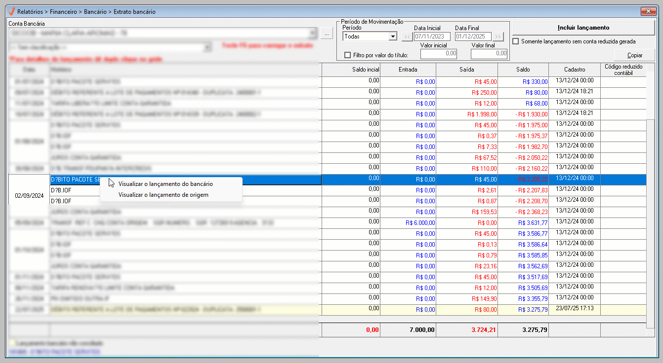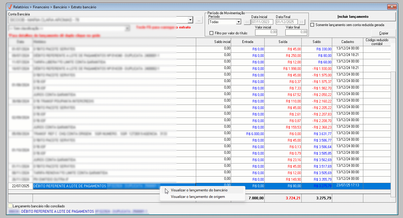 Após a consulta, a tela permite que o usuário visualize os detalhes de um lançamento específico. Para isso, clique com o botão direito do mouse sobre o extrato desejado. Ao clicar, serão exibidas duas opções, "Visualizar o lançamento bancário" e "Visualizar o lançamento de origem". O comportamento varia caso o lançamento seja conciliado ou não. Veja abaixo os dois cenários: