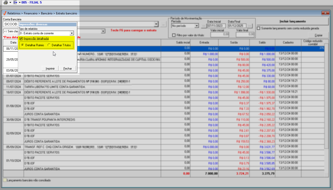 - Detalhar rateio: Destacará na impressão os rateios vinculados aos lançamentos.