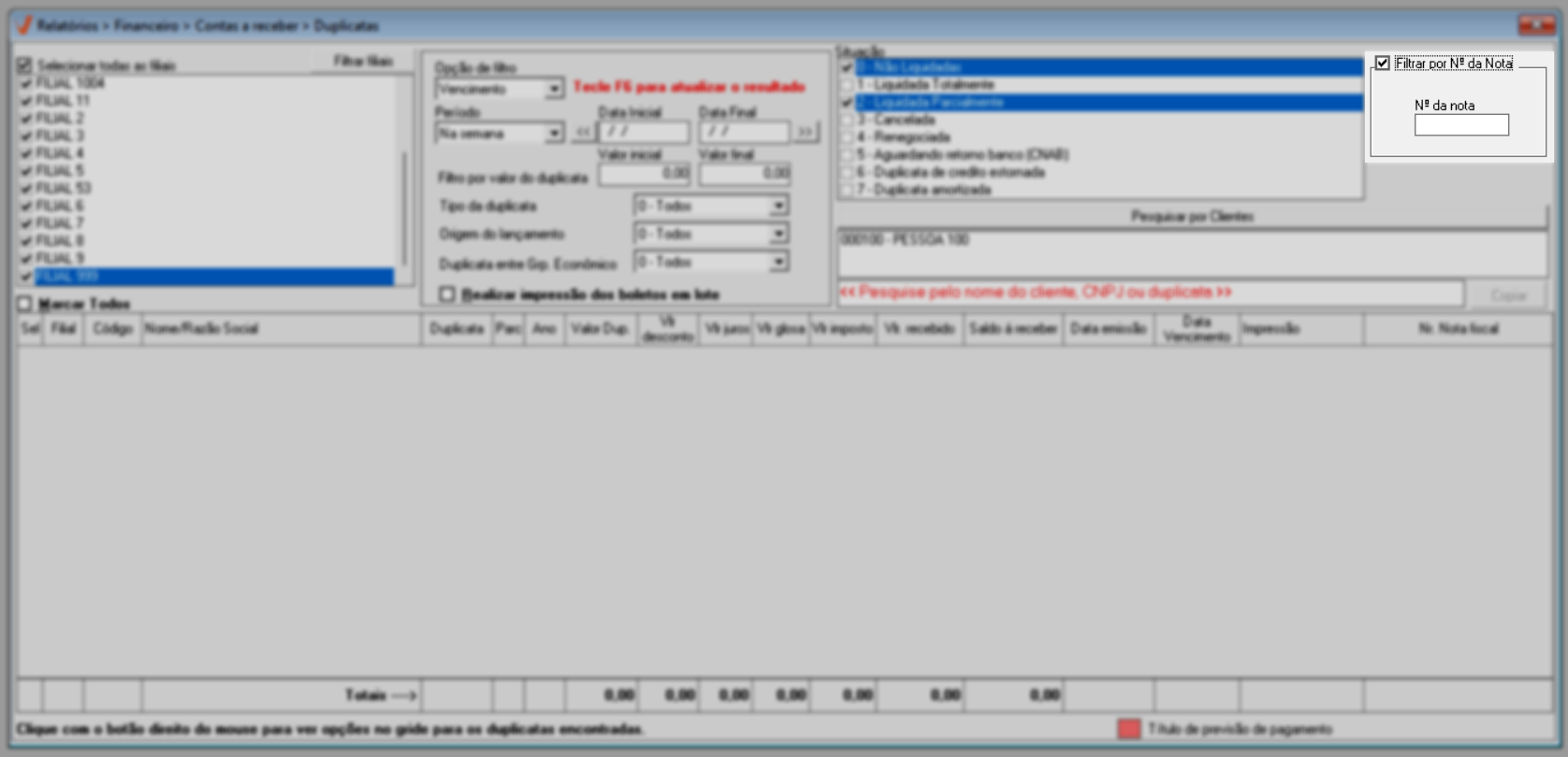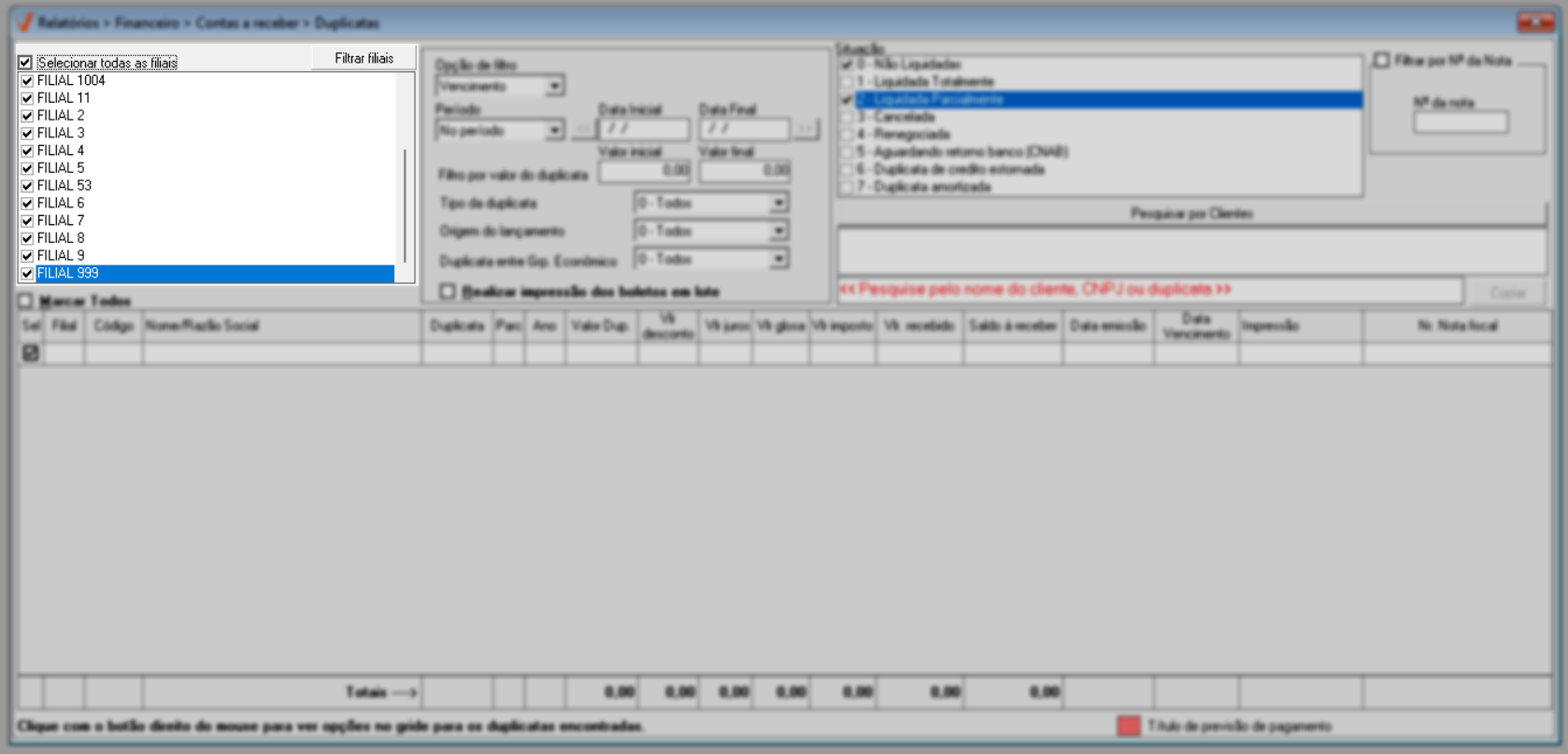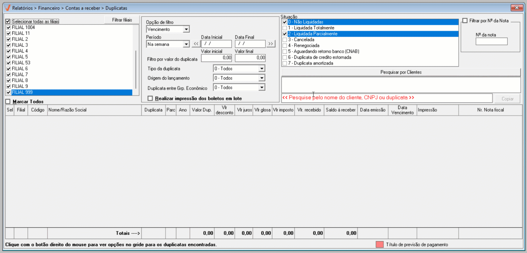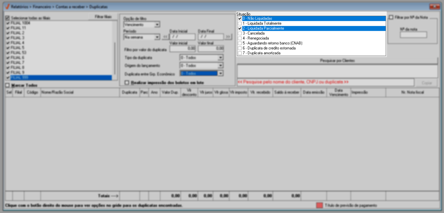 - 0 - Não Liquidadas: Duplicatas pendentes de pagamento que ainda não foram quitadas.