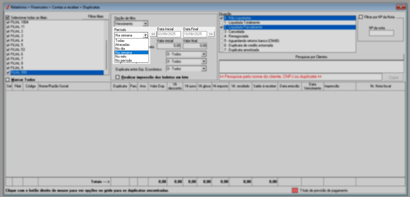 Após selecionar as filiais desejadas na consulta, o usuário poderá aplicar a pesquisa conforme os parâmetros previamente estabelecidos pelo sistema. Basta informar um "Período" de referência para a consulta das duplicatas e teclar o atalho F6 para concluir a pesquisa. Se desejar clique aqui e confira o artigo deste recurso.