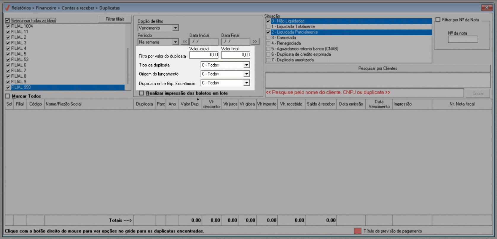 A seguir, o usuário poderá basear a consulta das duplicatas conforme os filtros seguintes:
