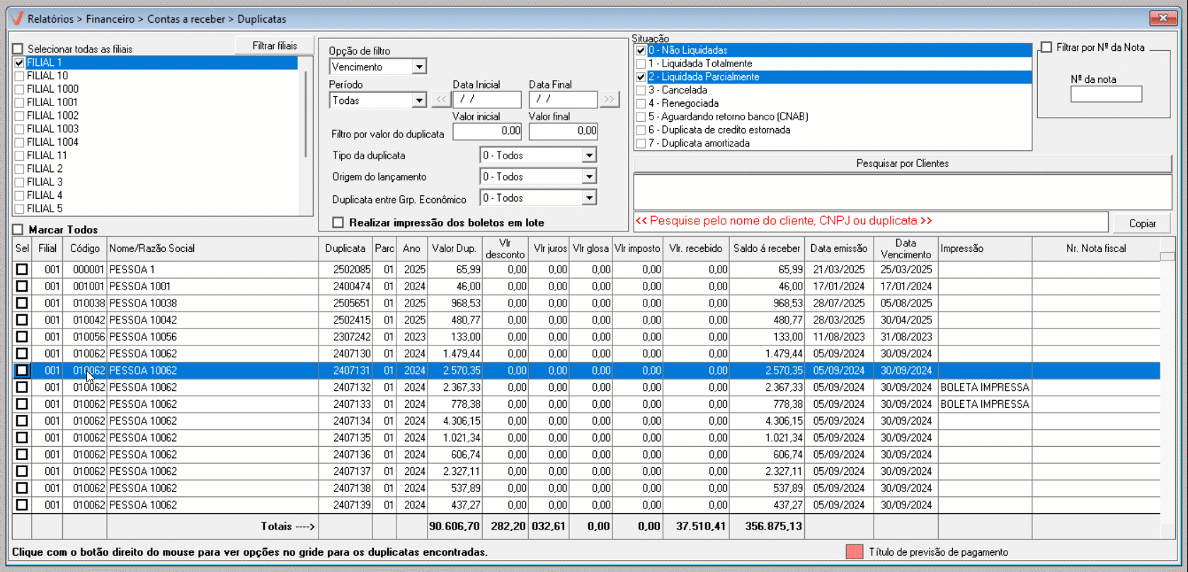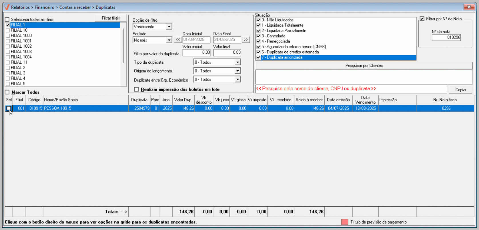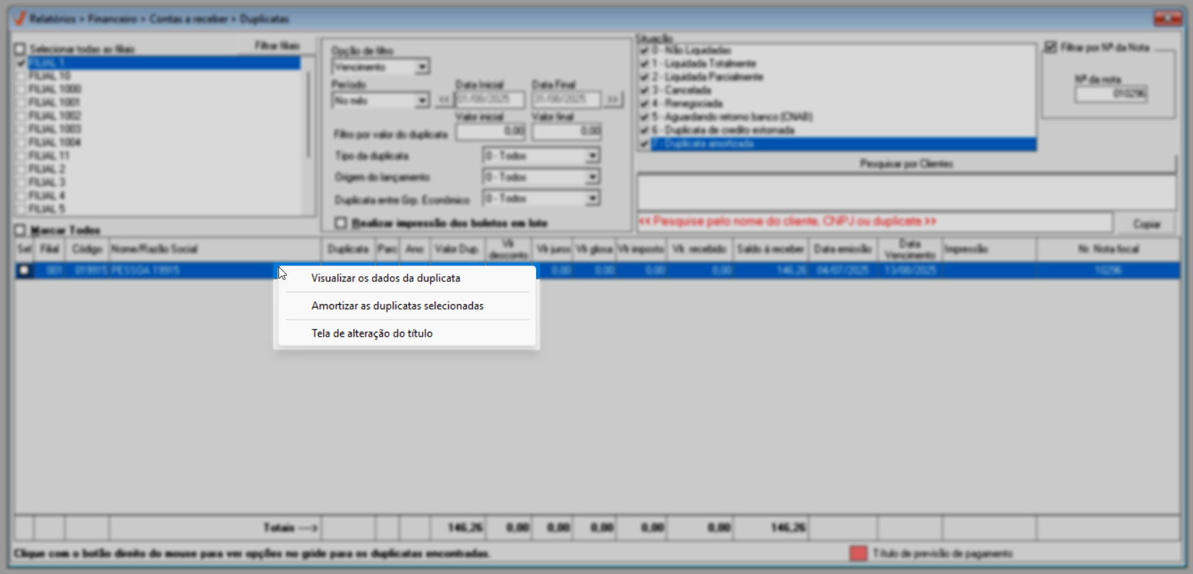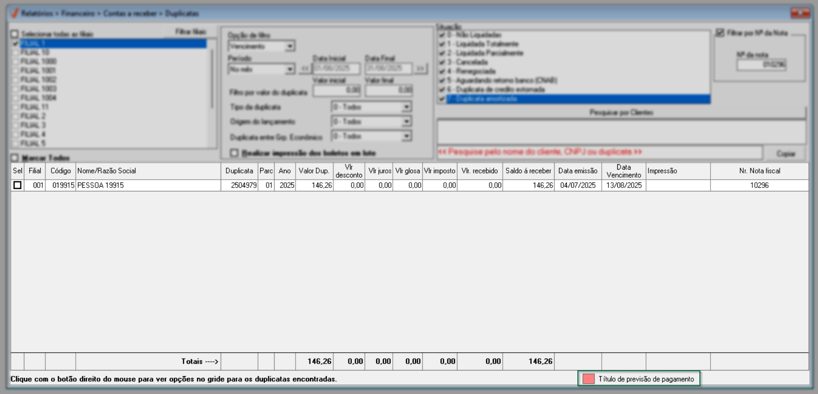 - Filial: Loja de origem da duplicata.