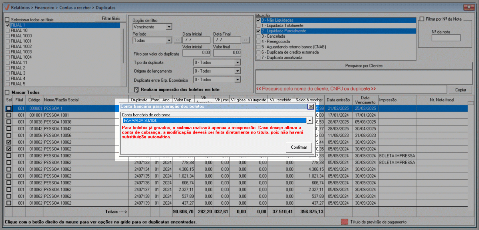 É importante destacar que as duplicatas selecionadas para impressão em lote devem pertencem ao mesmo grupo econômico. Se forem escolhidas duplicatas de grupos diferentes, o sistema exibirá um alerta. Nesse caso, ajuste a seleção e marque novamente a opção "Realizar impressão dos boletos em lote".