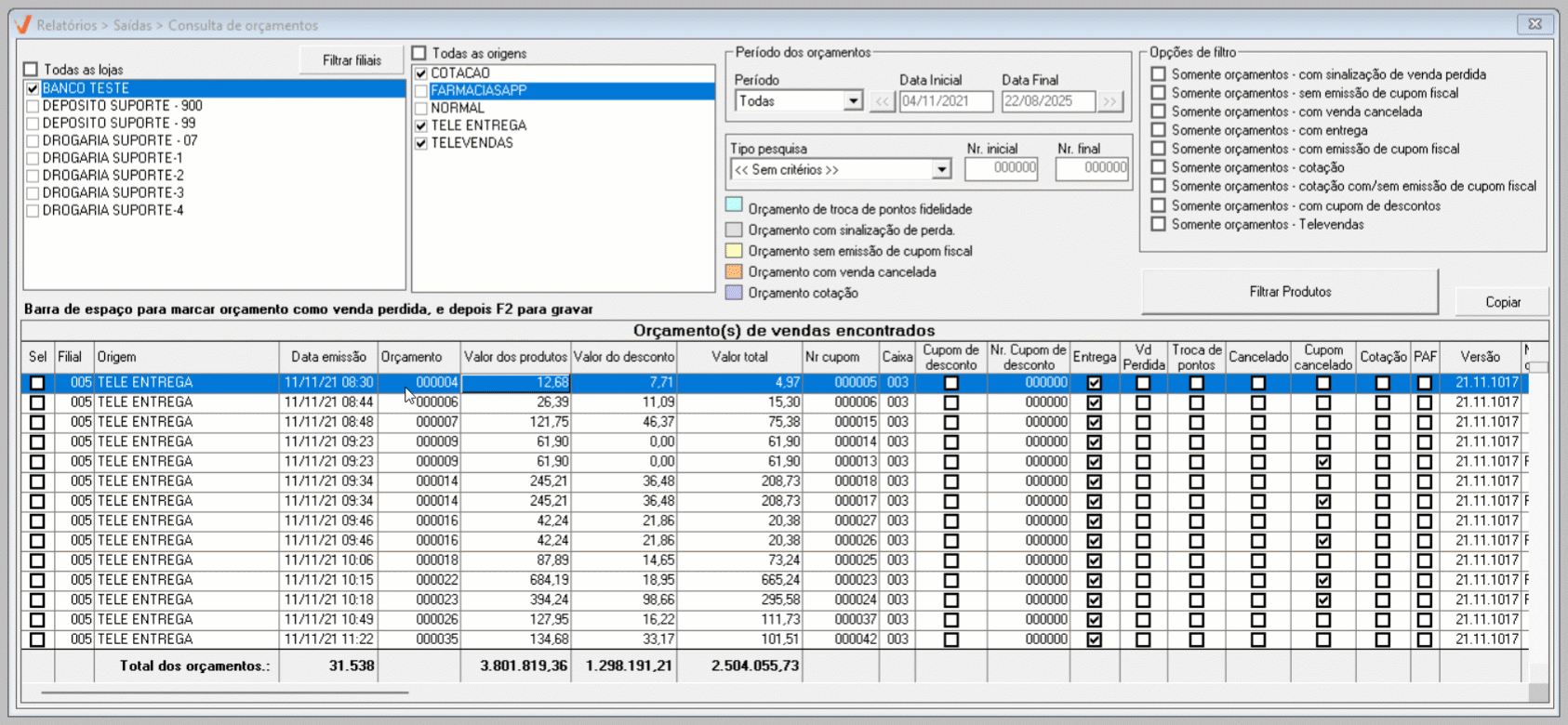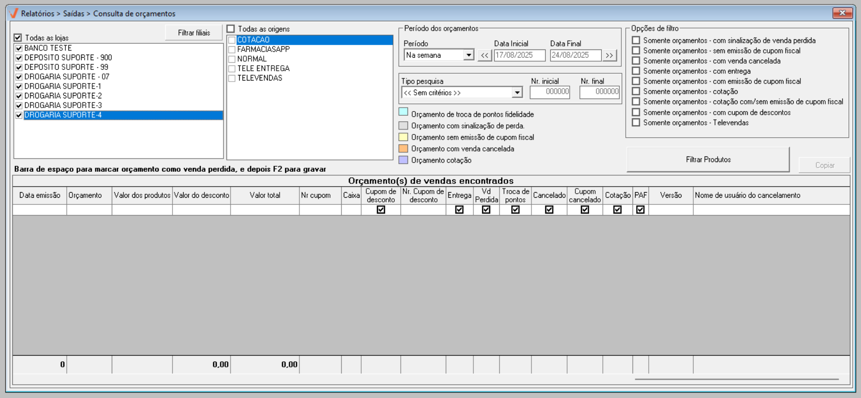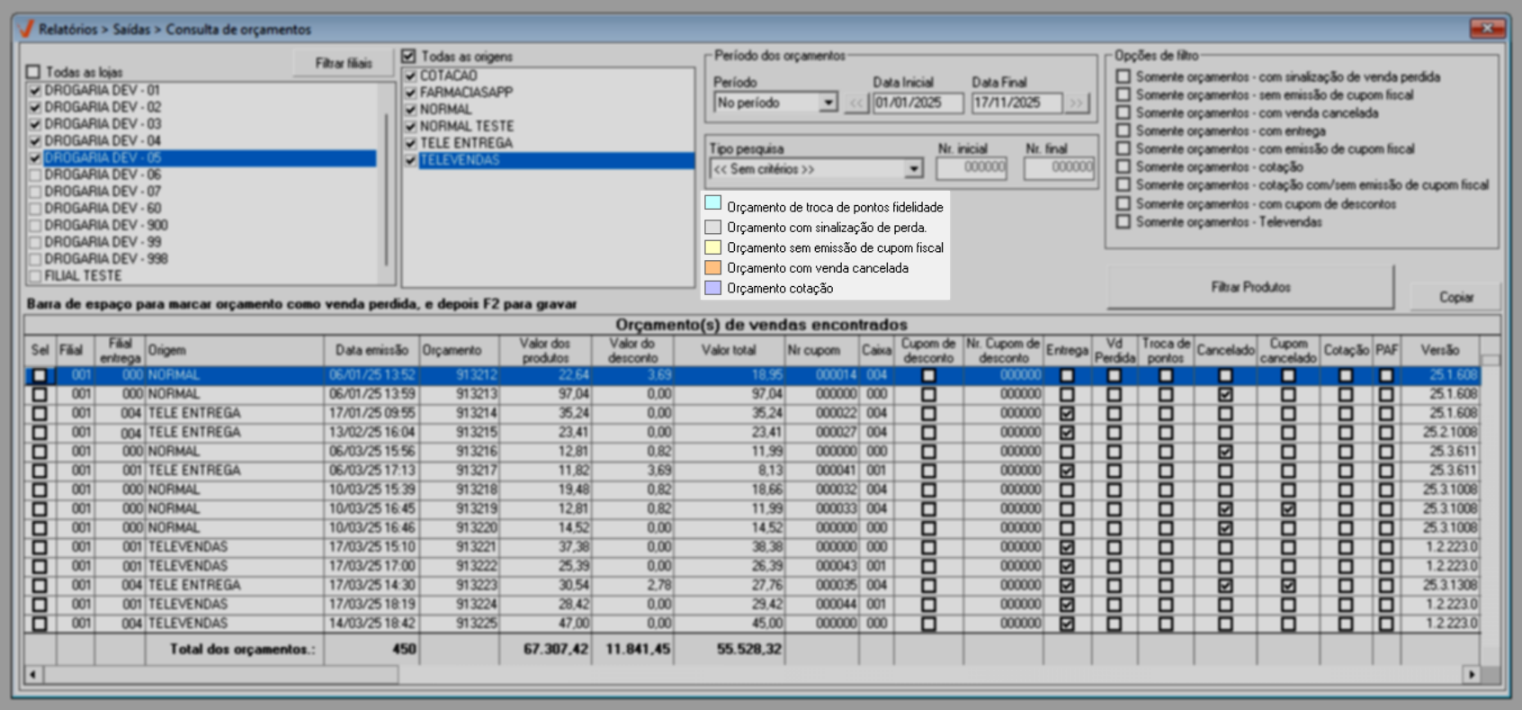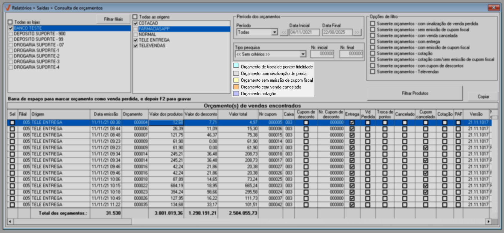 - Verde: identificará os orçamentos que tiveram troca de pontos fidelidade;