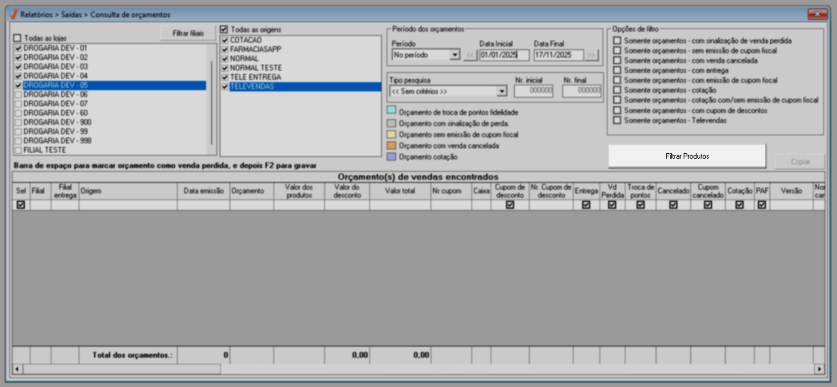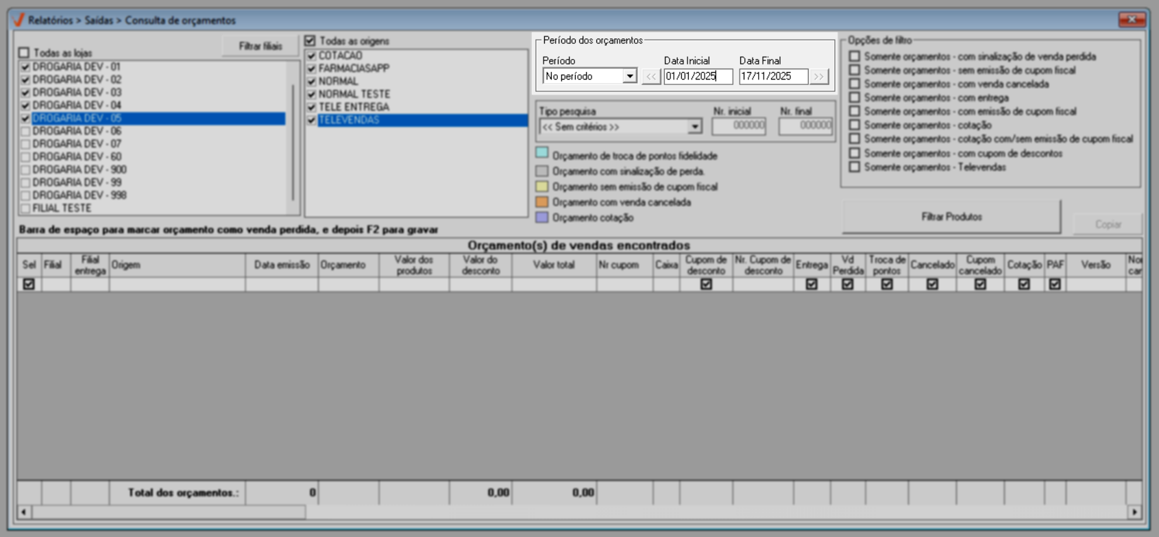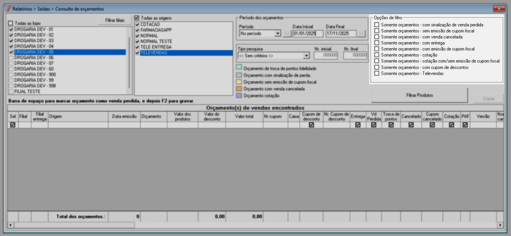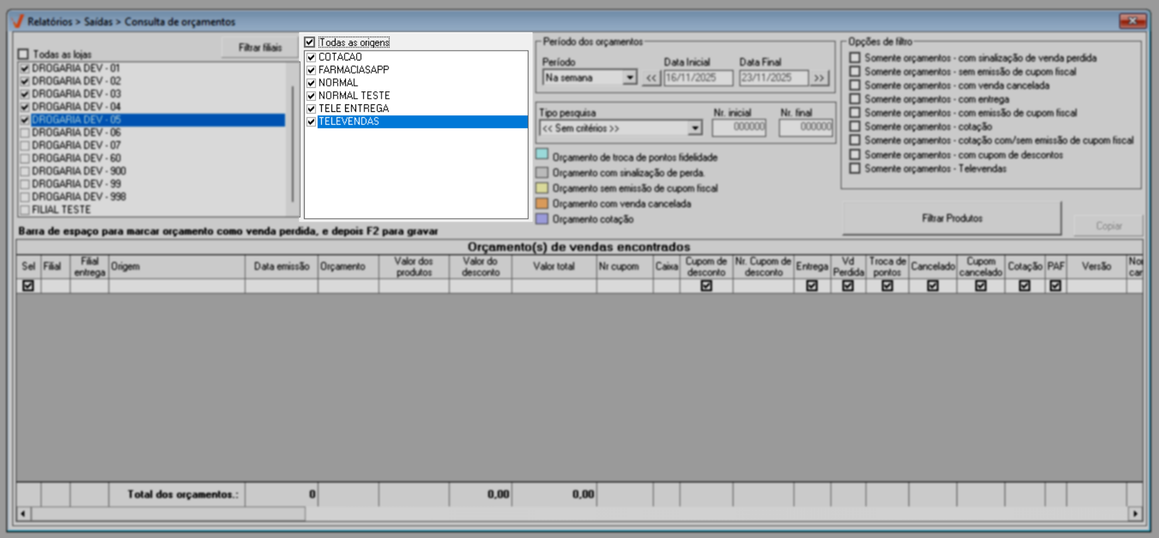 Para gerenciar os orçamentos realizados nas lojas de forma mais eficiente, esta tela proporcionará a criação de um relatório simples, com base em um período determinado, origem das vendas, as filiais escolhidas e outros filtros que permitem uma busca mais refinada. Esse relatório permitirá revisar as vendas e cotações realizadas na loja, além de destacar os orçamentos classificados como "Venda perdida".