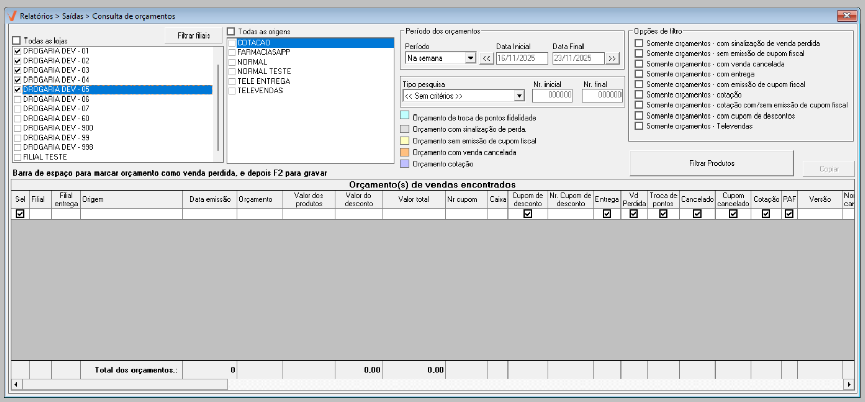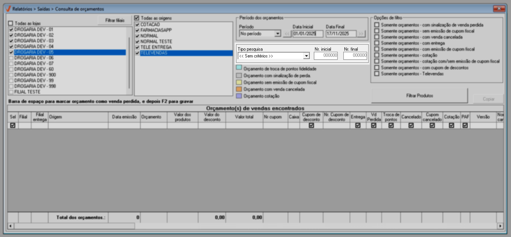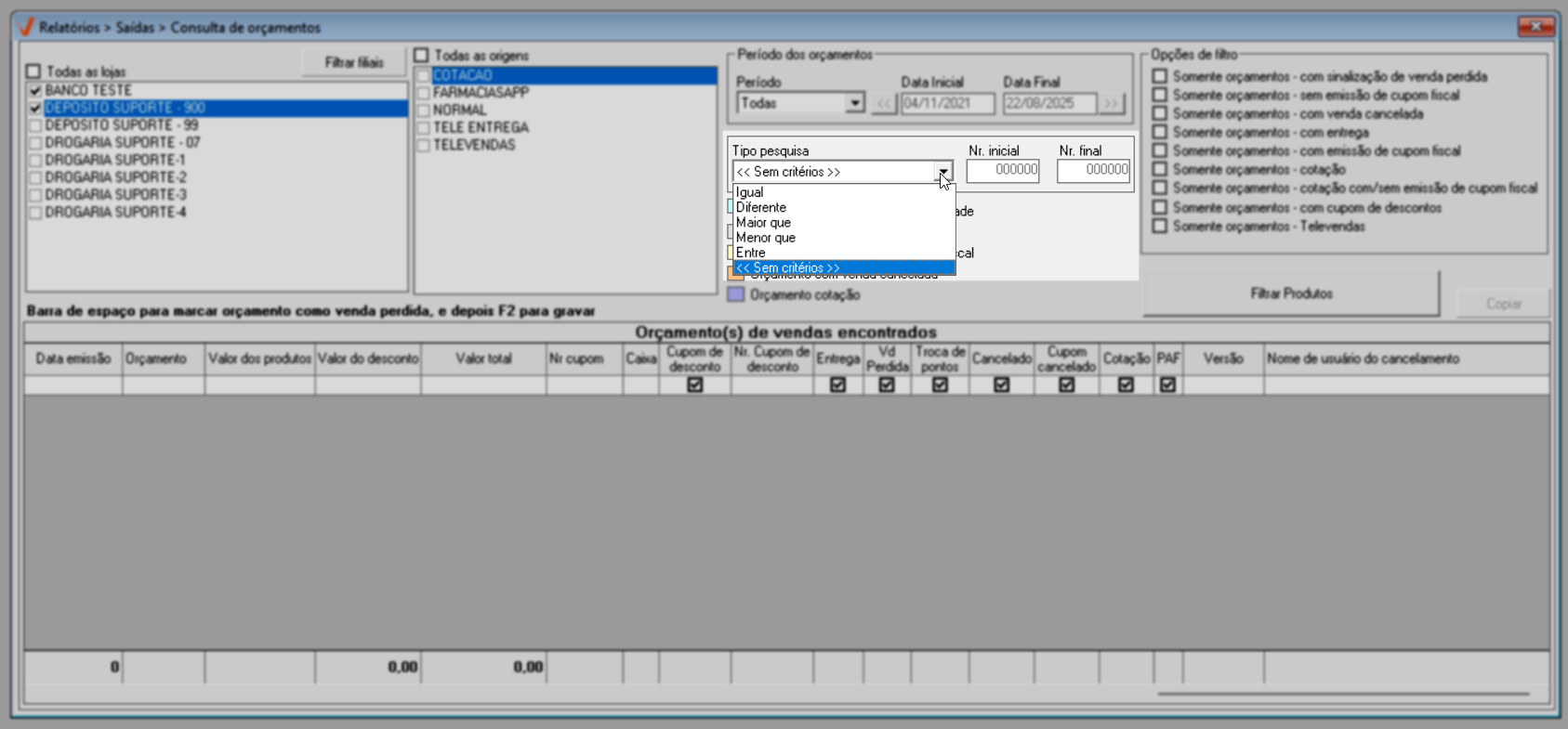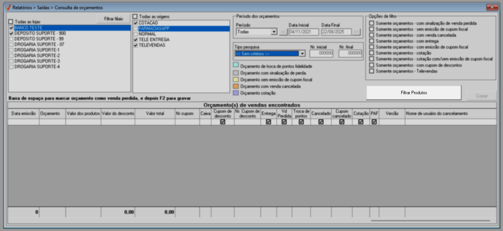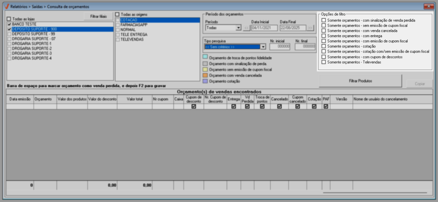 Para gerenciar os orçamentos realizados nas lojas de forma mais eficiente, esta tela proporcionará a criação de um relatório simples, com base em um período determinado, origem das vendas, as filiais escolhidas e outros filtros que permitem uma busca mais refinada. Esse relatório permitirá revisar as vendas e cotações realizadas na loja, além de destacar os orçamentos classificados como "Venda perdida".