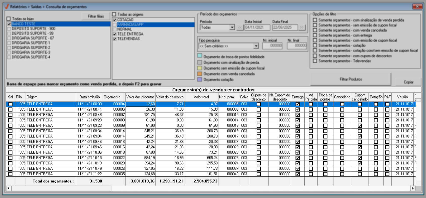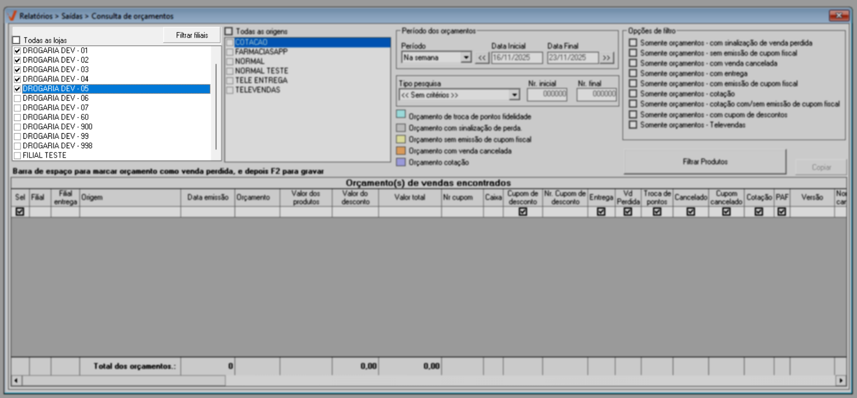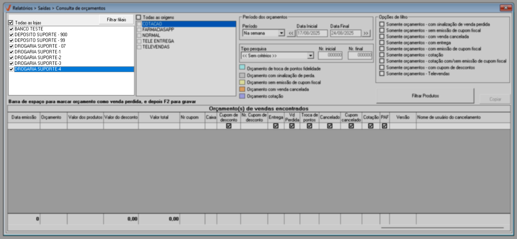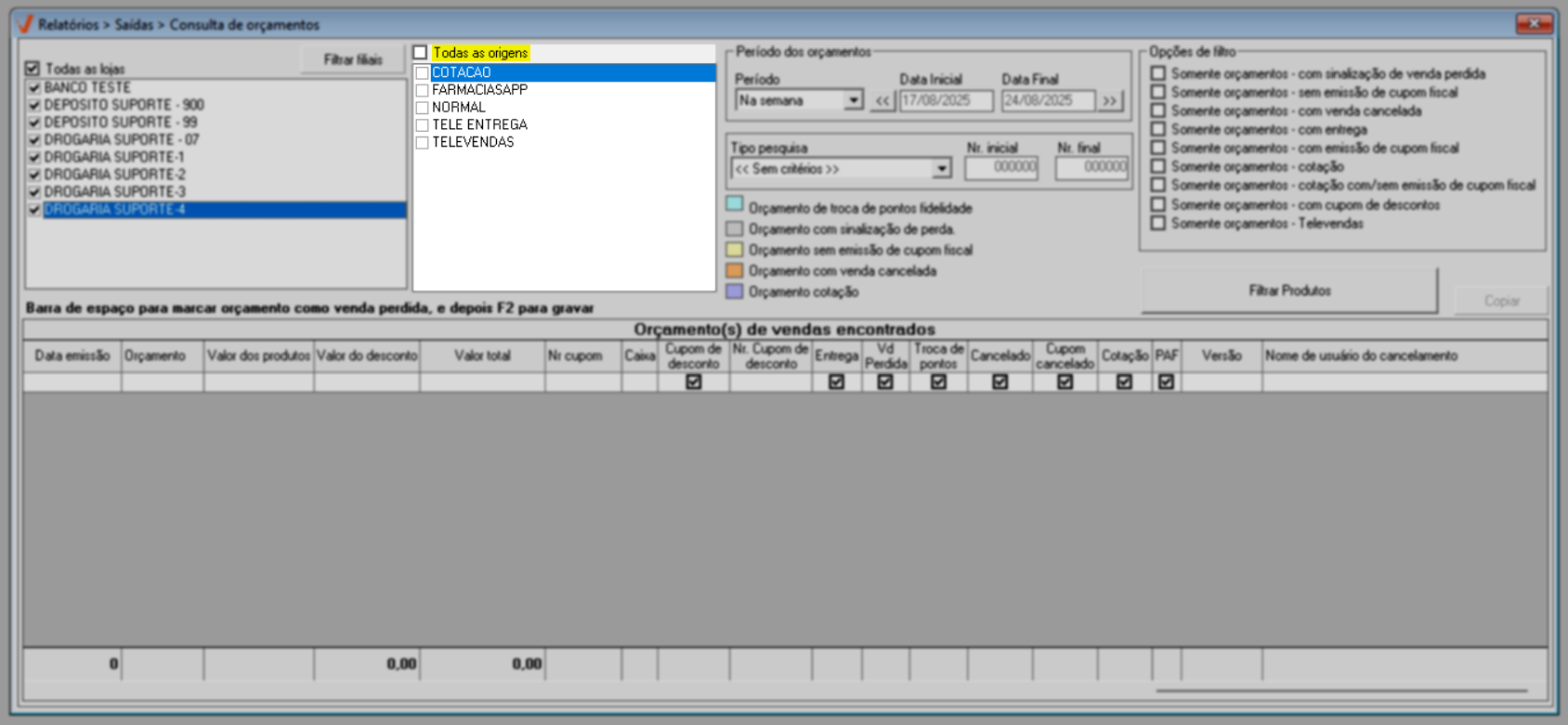 Para gerenciar os orçamentos realizados nas lojas de forma mais eficiente, esta tela proporcionará a criação de um relatório simples, com base em um período determinado, origem das vendas, as filiais escolhidas e outros filtros que permitem uma busca mais refinada. Esse relatório permitirá revisar as vendas e cotações realizadas na loja, além de destacar os orçamentos classificados como "Venda perdida".