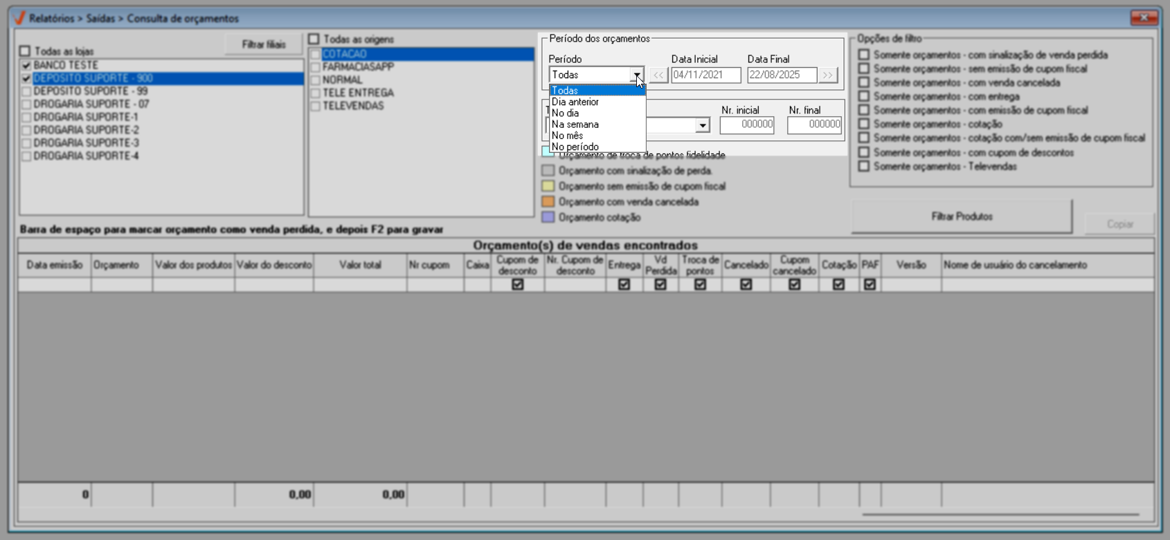 - Somente orçamentos - cotação com/sem emissão de cupom fiscal: relacionará apenas os orçamentos de cotação que foram convertidos ou não em venda no PDV;