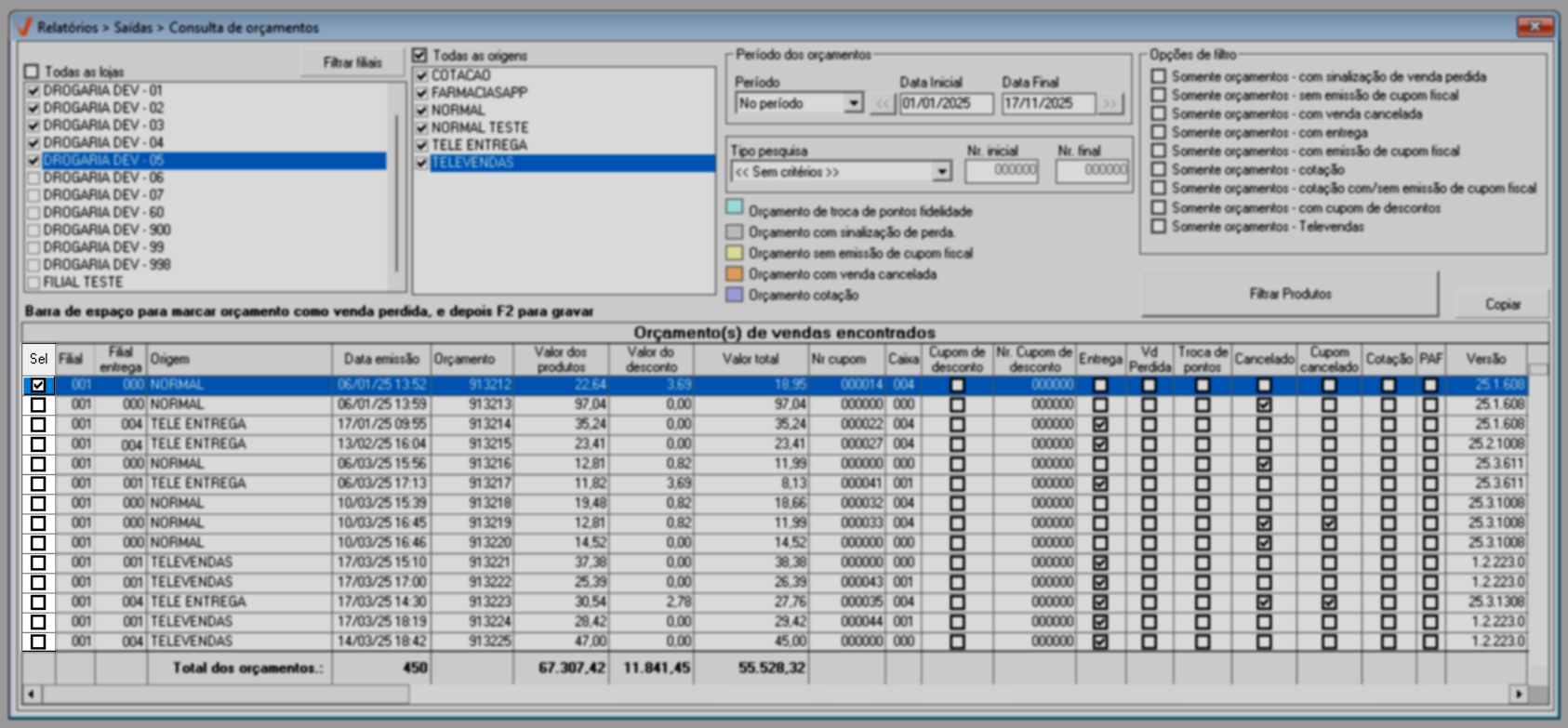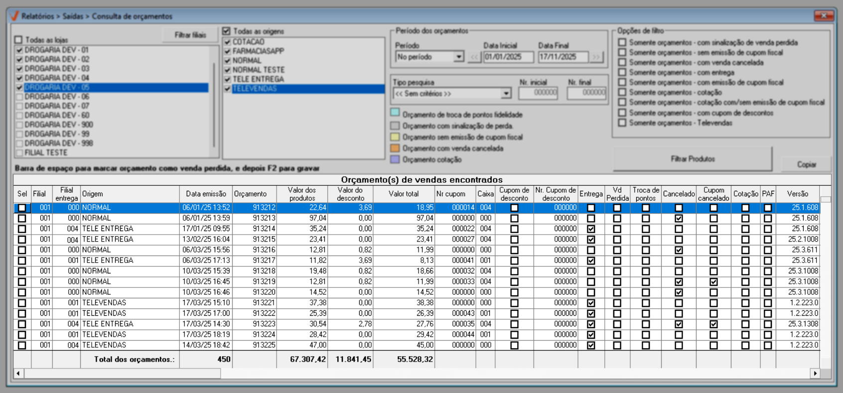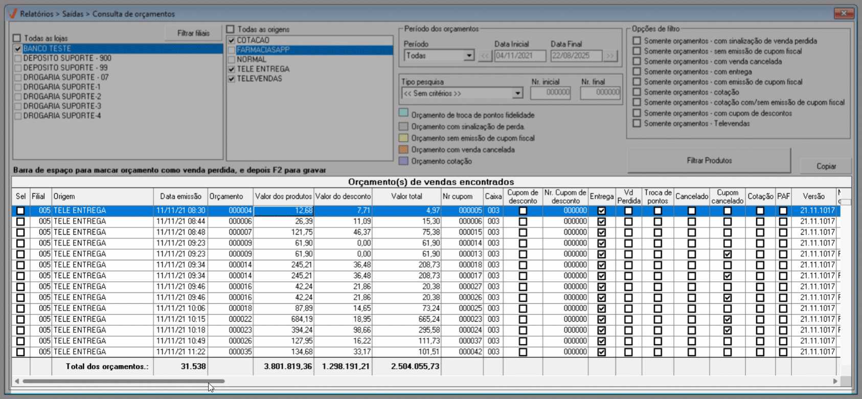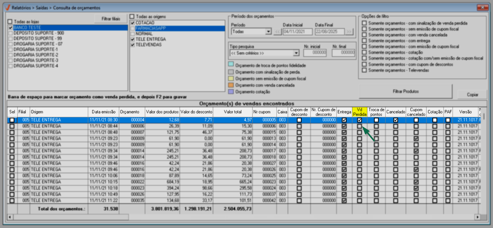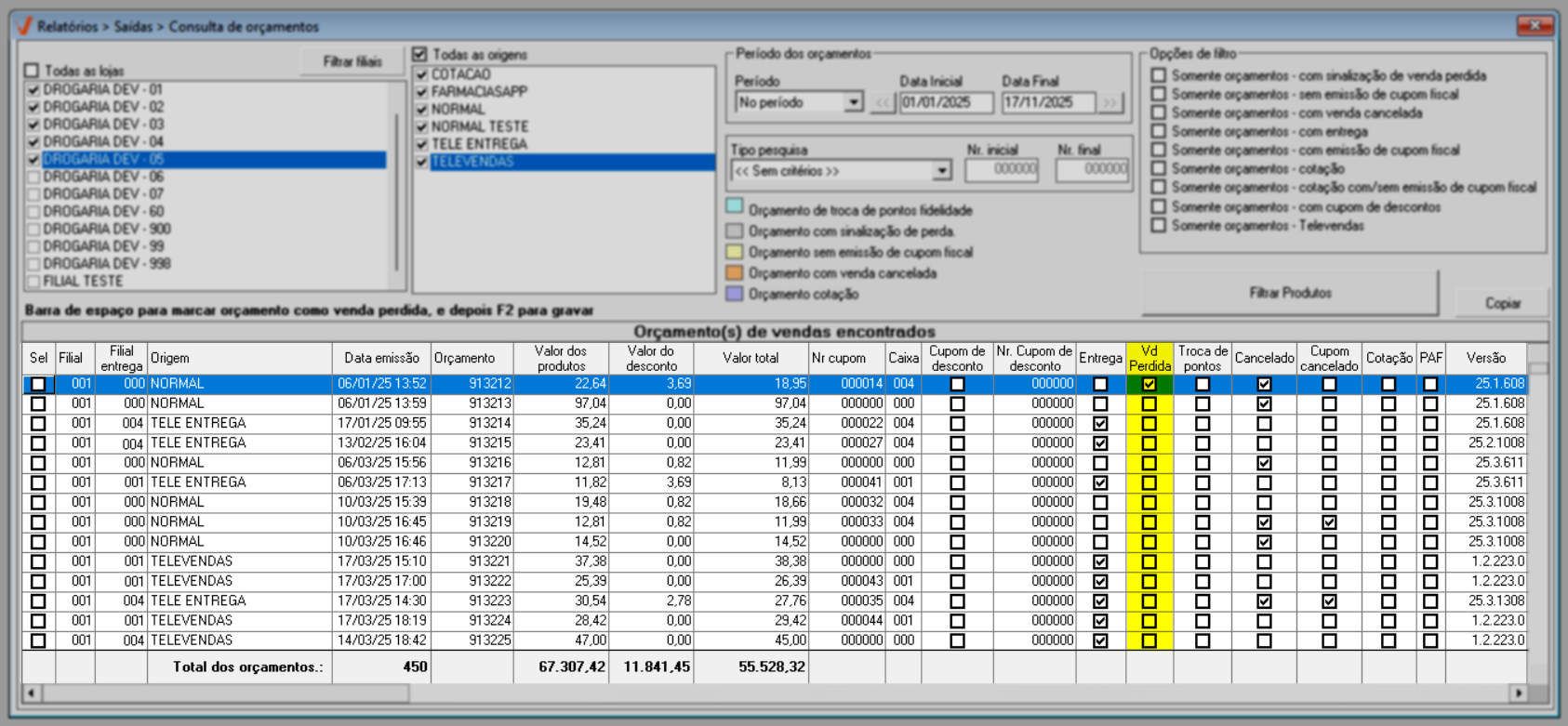 - VdPerdida: quando as caixas de seleção dessa coluna estiverem marcadas, significa que o prazo do orçamento expirou, ou seja, se ele não foi convertido em uma venda dentro do período definido;