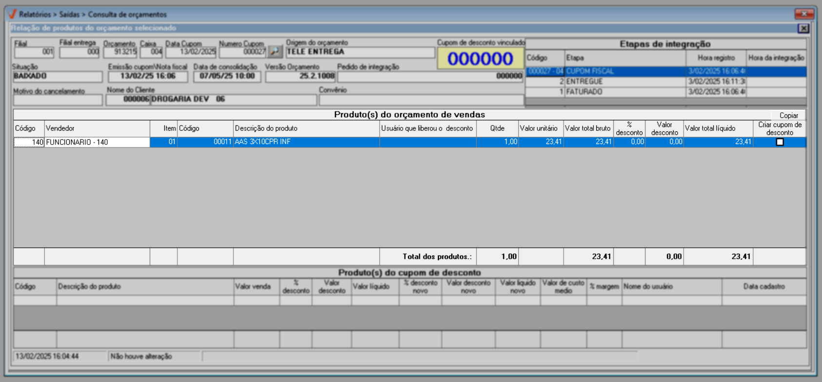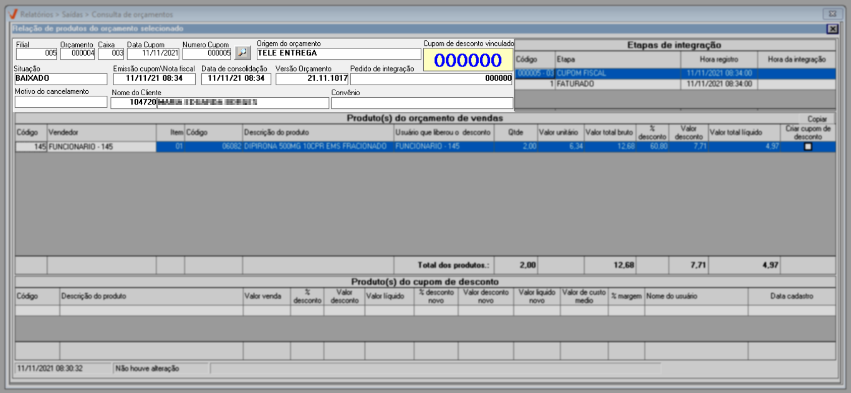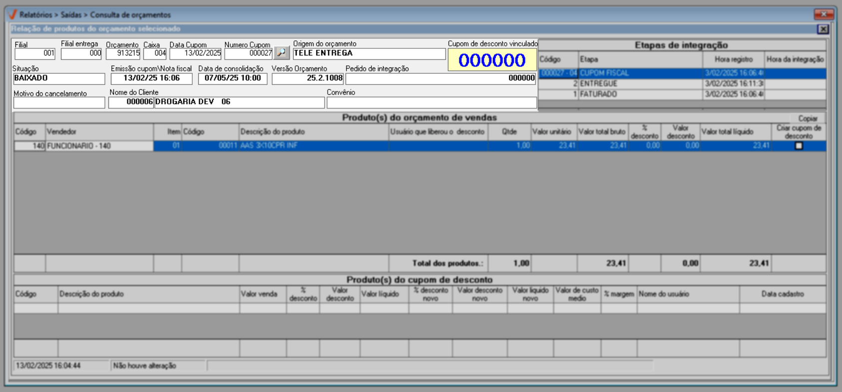 - Nr Cupom de desconto: número do cupom de desconto, caso exista um cupom vinculado ao orçamento;