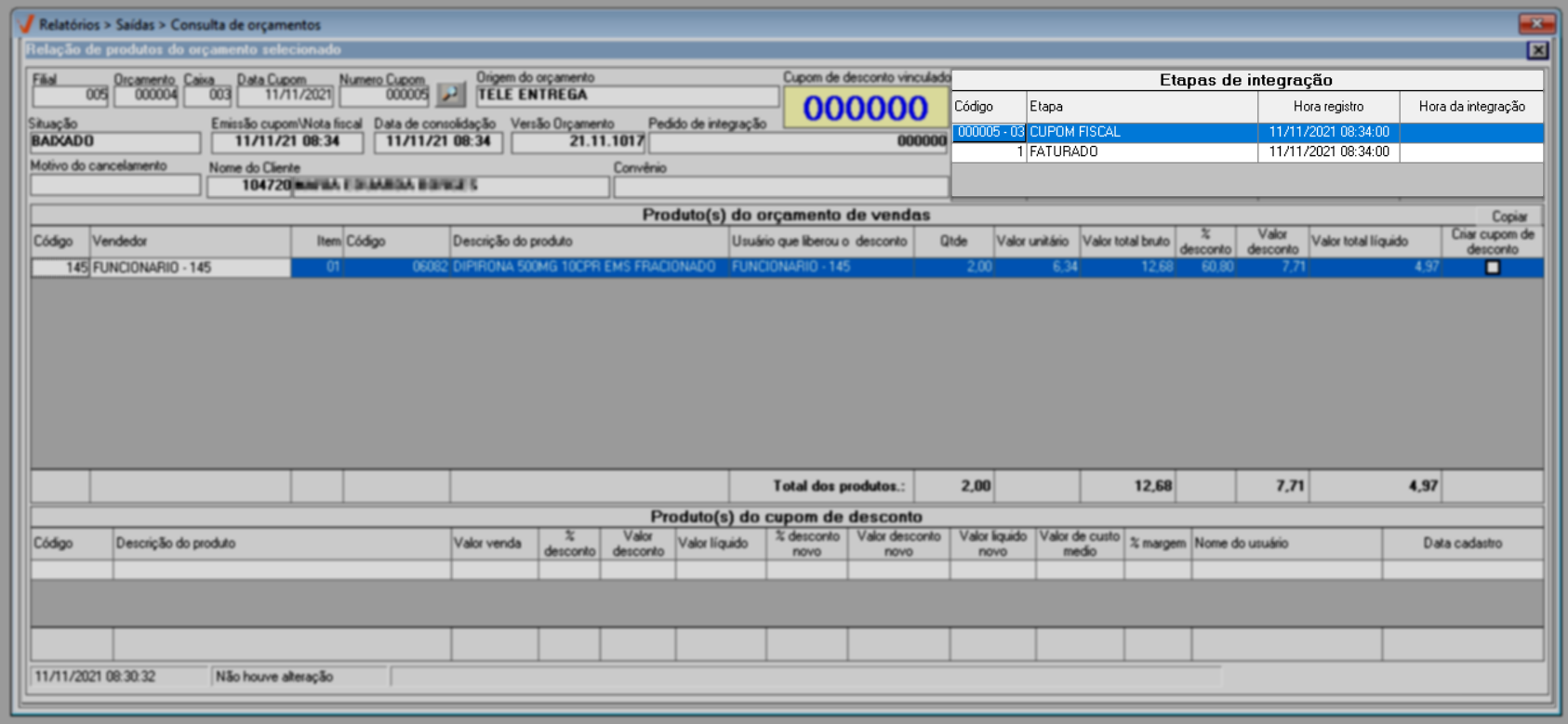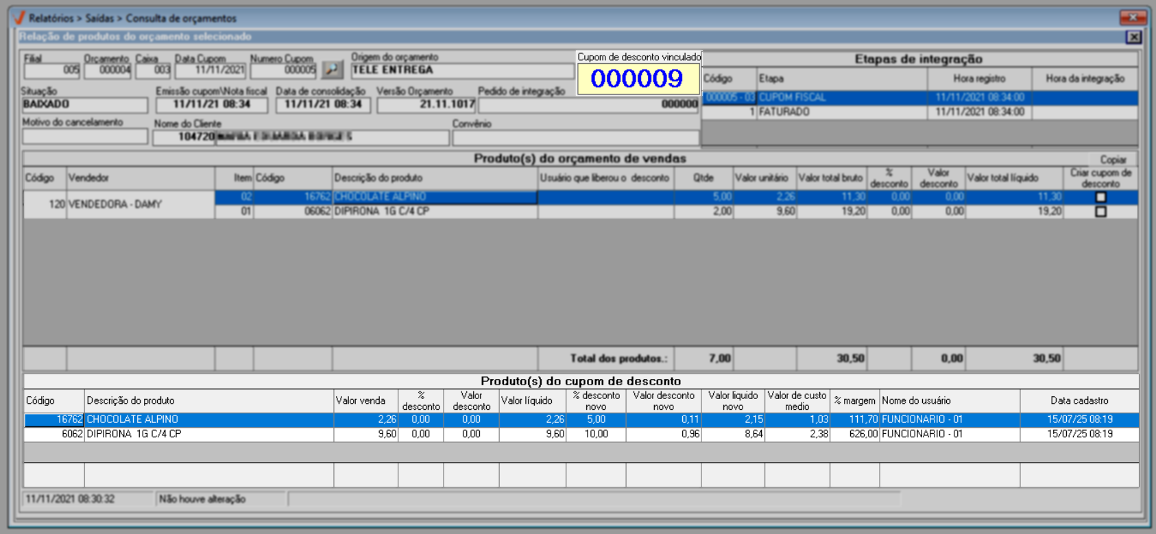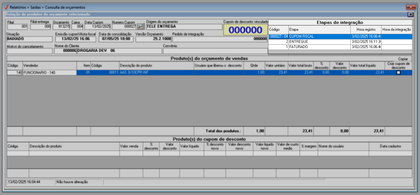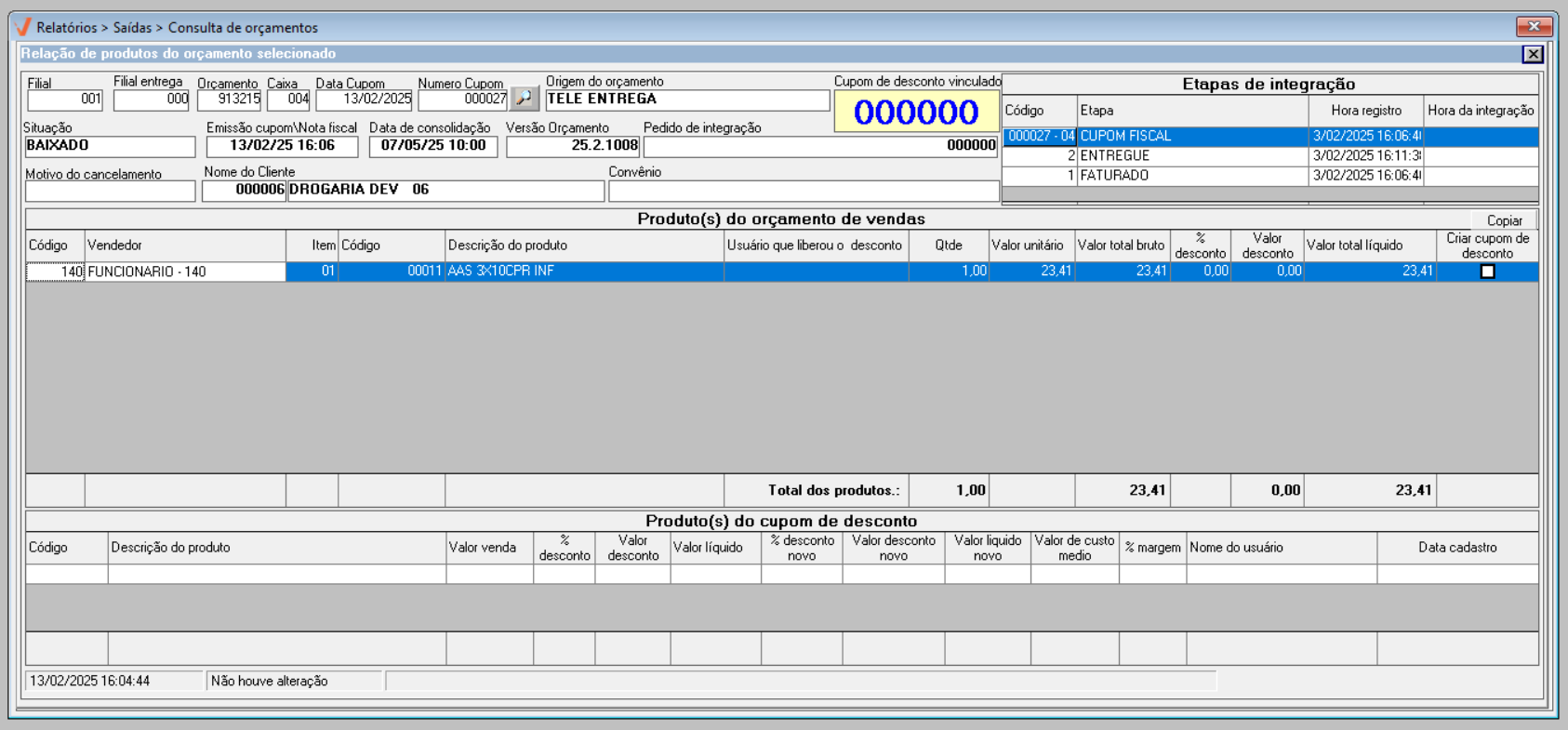 - Nr Cupom de desconto: número do cupom de desconto, caso exista um cupom vinculado ao orçamento;